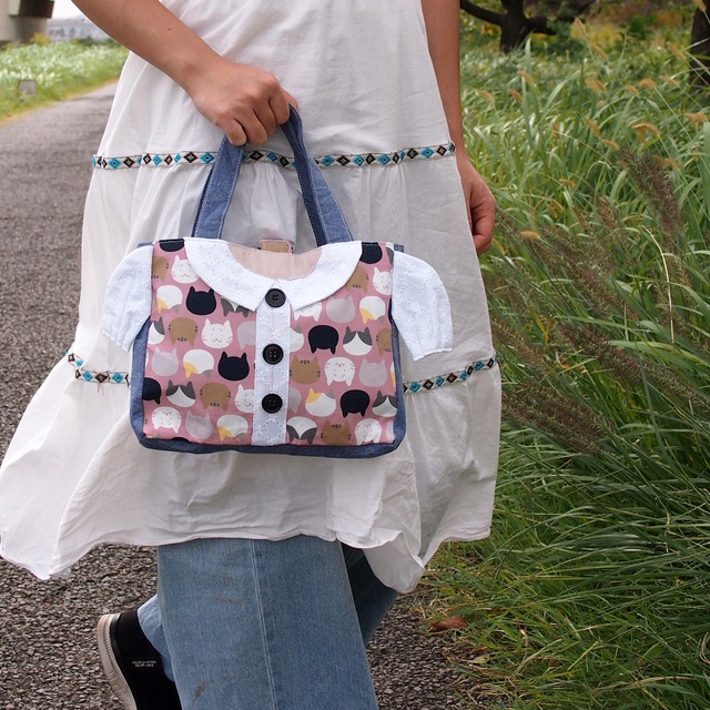 お洋服型のバッグ ピンク まゆねこいっぱい柄 ですもに ブラウスの形のバッグを作りました。 袖と襟部分は白のレース。 身頃にはまゆねこの生地を使いました。 芯を入れてあるので少し硬めの感触です。 留めはマジックテープです。裏側には2つ別れたポケット。 裏地あり。内側ポケット無し。 お散歩やご近所のお買いものなど気軽に使えそうなバッグです。 手作業による作品です。ハンドメイド感をご了承ください。 ** 素材 ** ■綿100% ** サイズ ** ■横 24.5cm ■縦 20cm ■マチ 5cm ■取っ手 34cm ※寸法は多少の誤差があります。平置きで測っています。 大人気の猫イラスト柄。珍しい形のオリジナルバッグです。 猫バッグ ねこ 猫 トート 納期:約5日