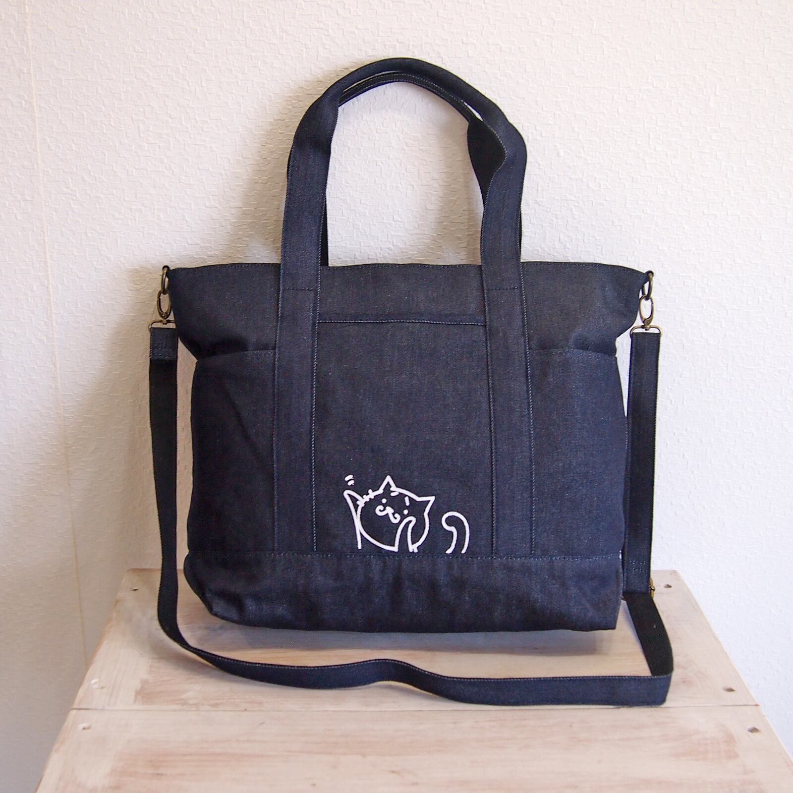 A4トートバッグ猫 差し色 ネイビー 2WAY ショルダー