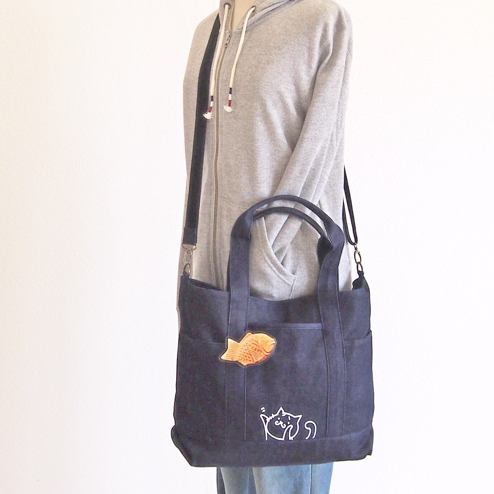 (Lサイズ)A4 トートバッグ まゆねこ便利ファスナー ポケット 2WAY帆布 猫 たい焼きですもに
