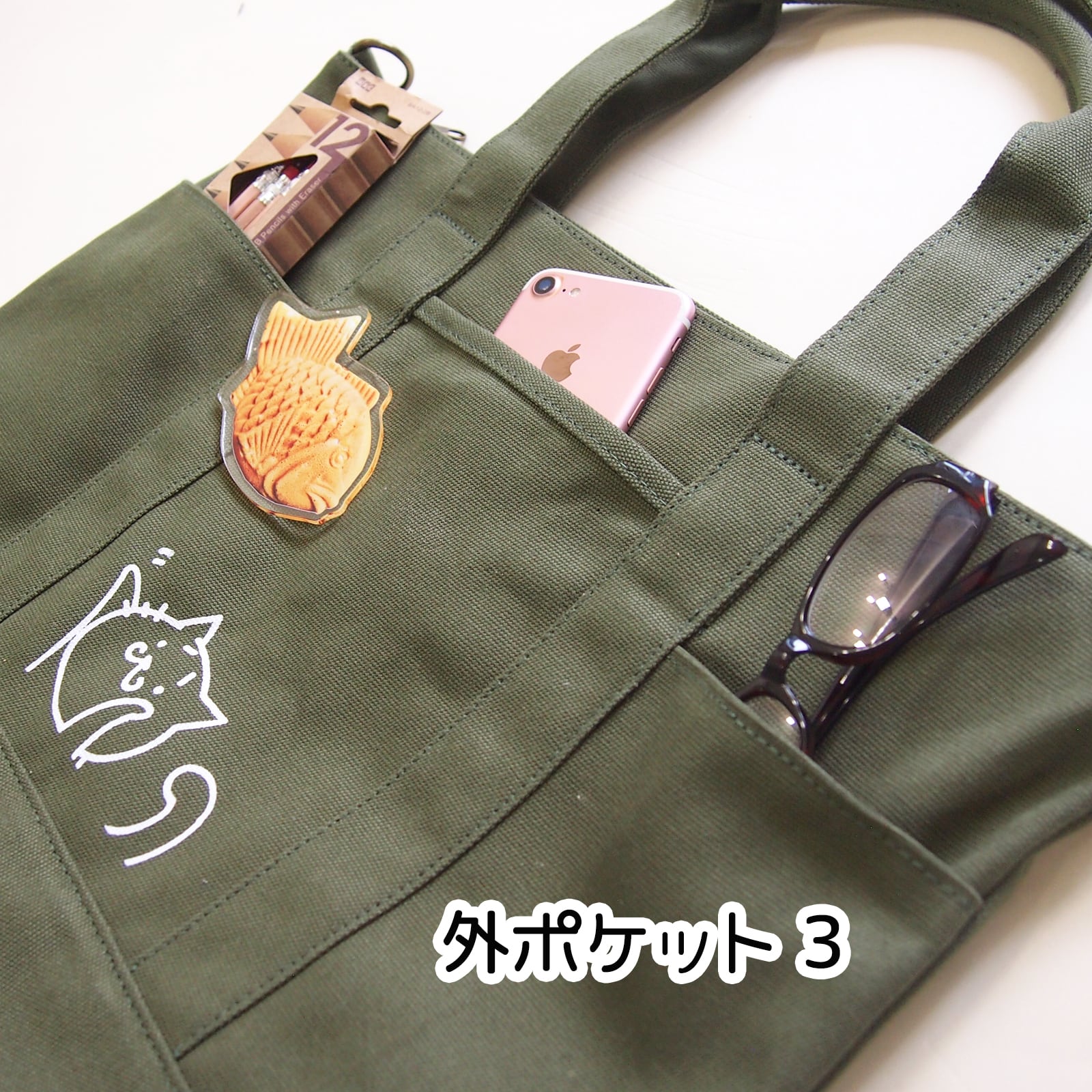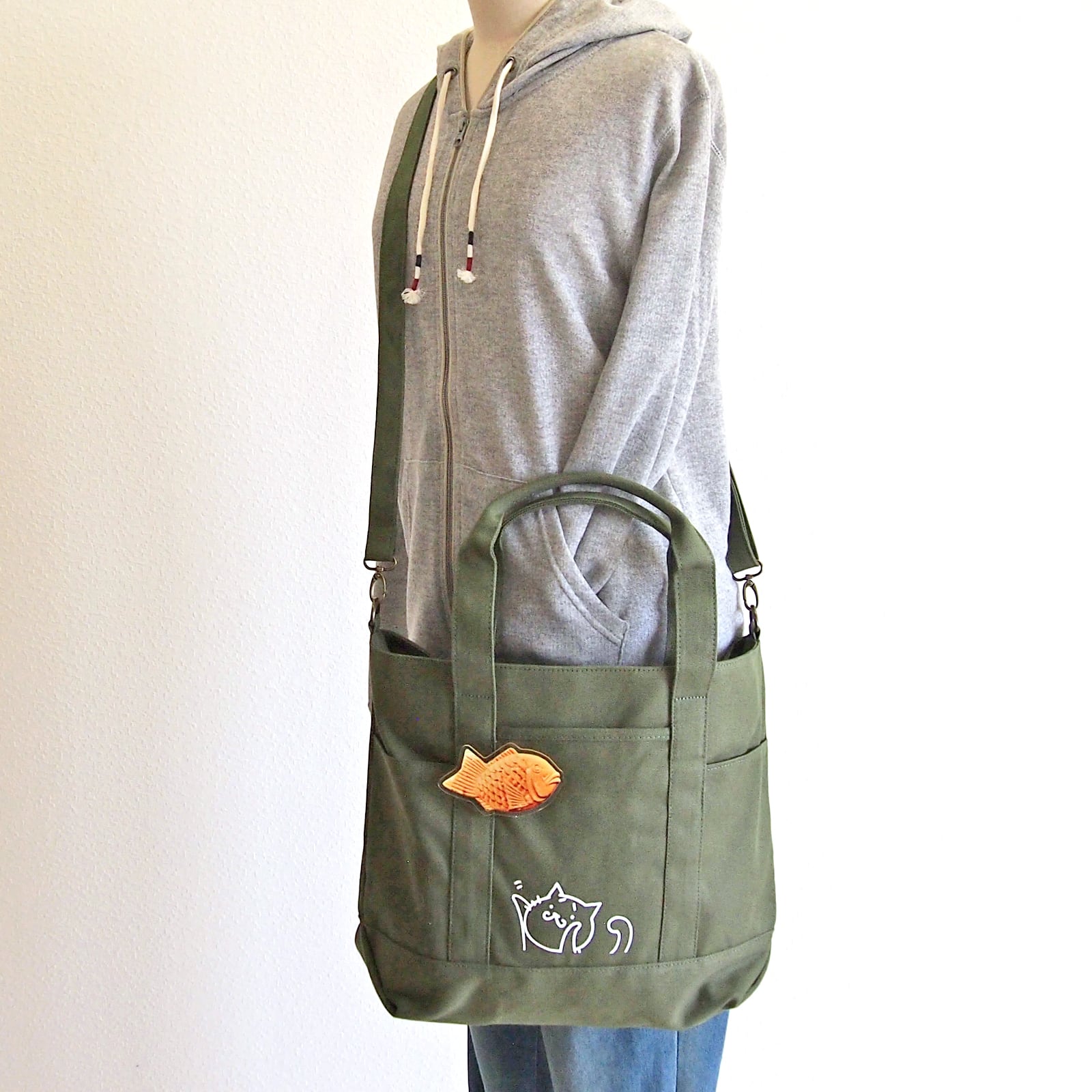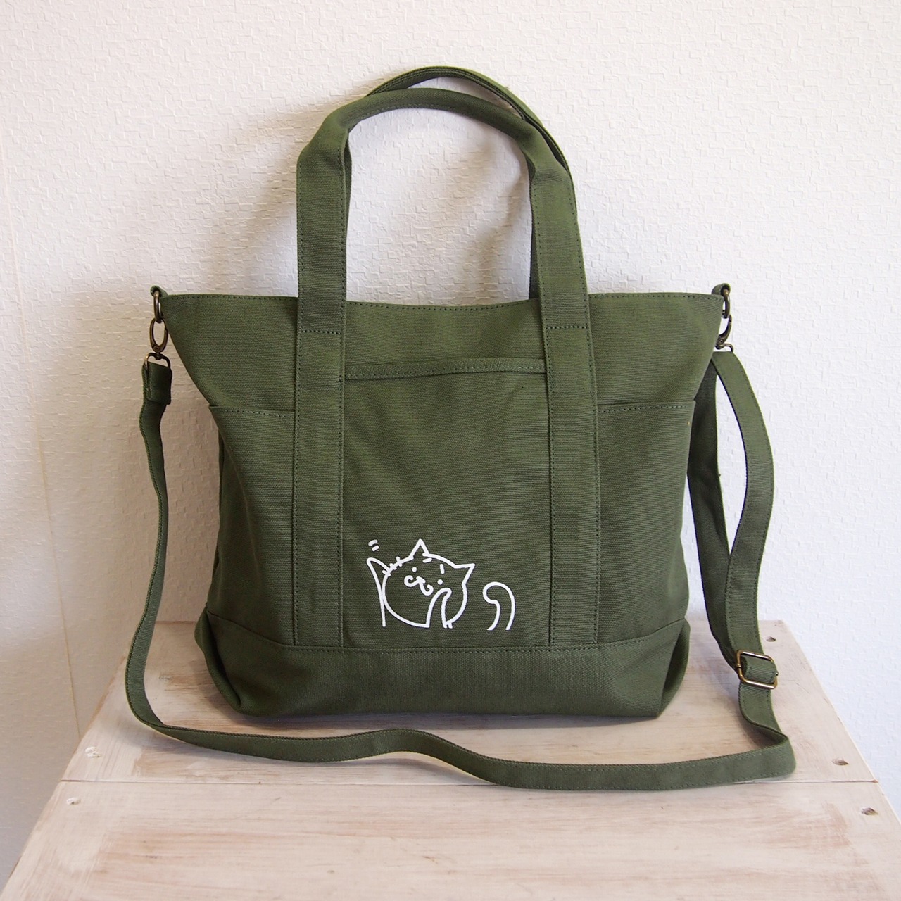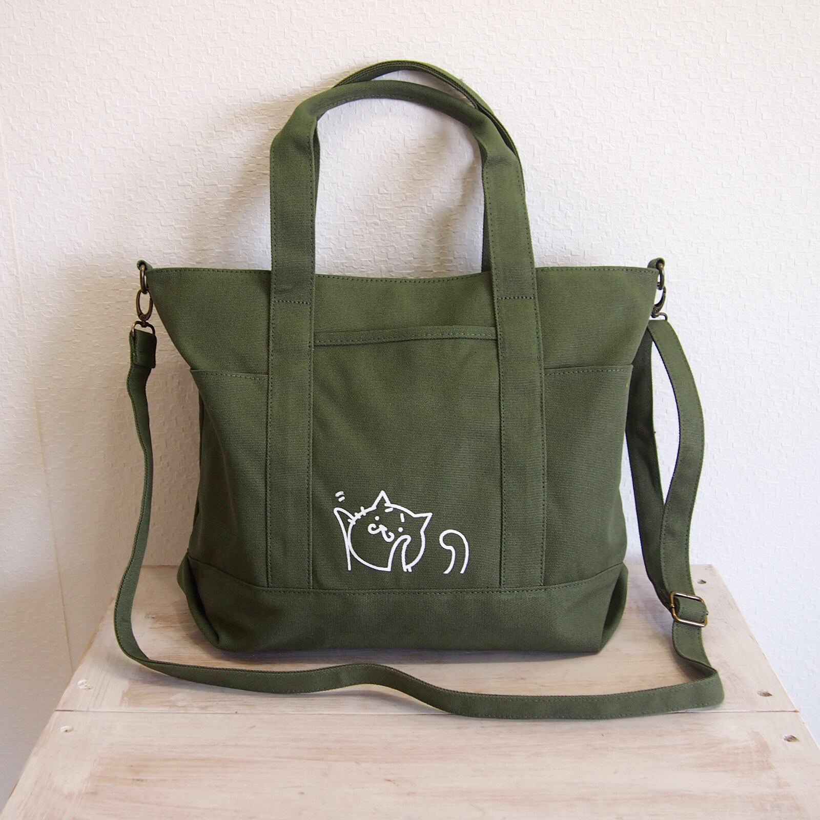 A4トートバッグ猫 差し色 カーキグリーン 2WAY ショルダー