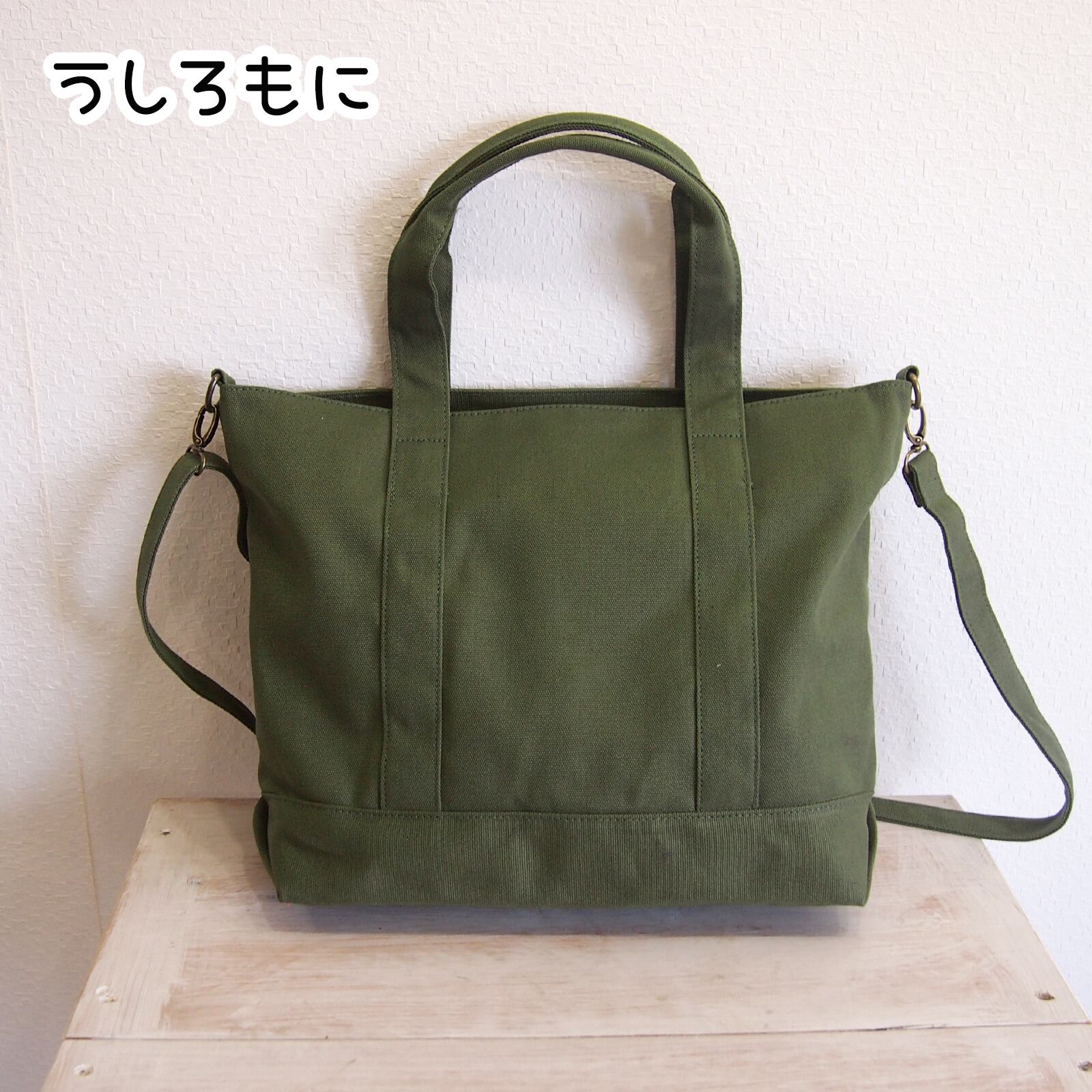 カーキグリーンなキャンバス地のトートバッグもによ