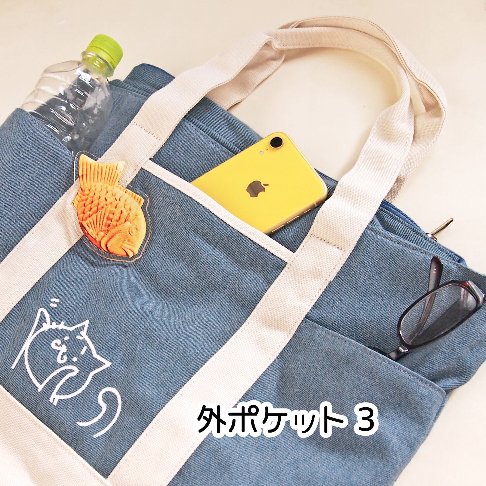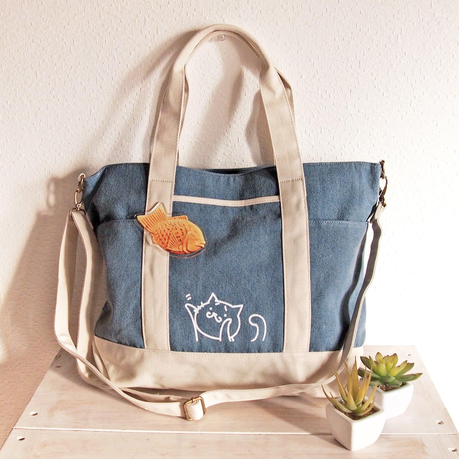 (Lサイズ)A4 トートバッグ まゆねこ便利ファスナー ポケット 2WAY帆布 猫 たい焼きですもに