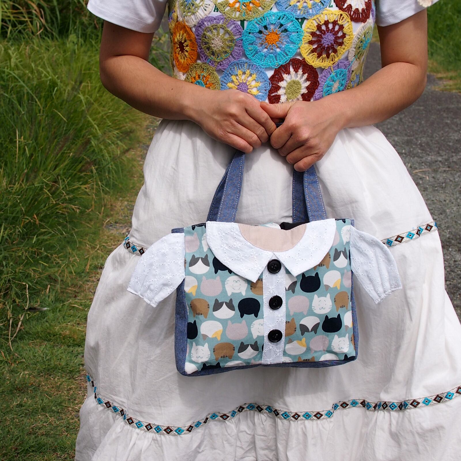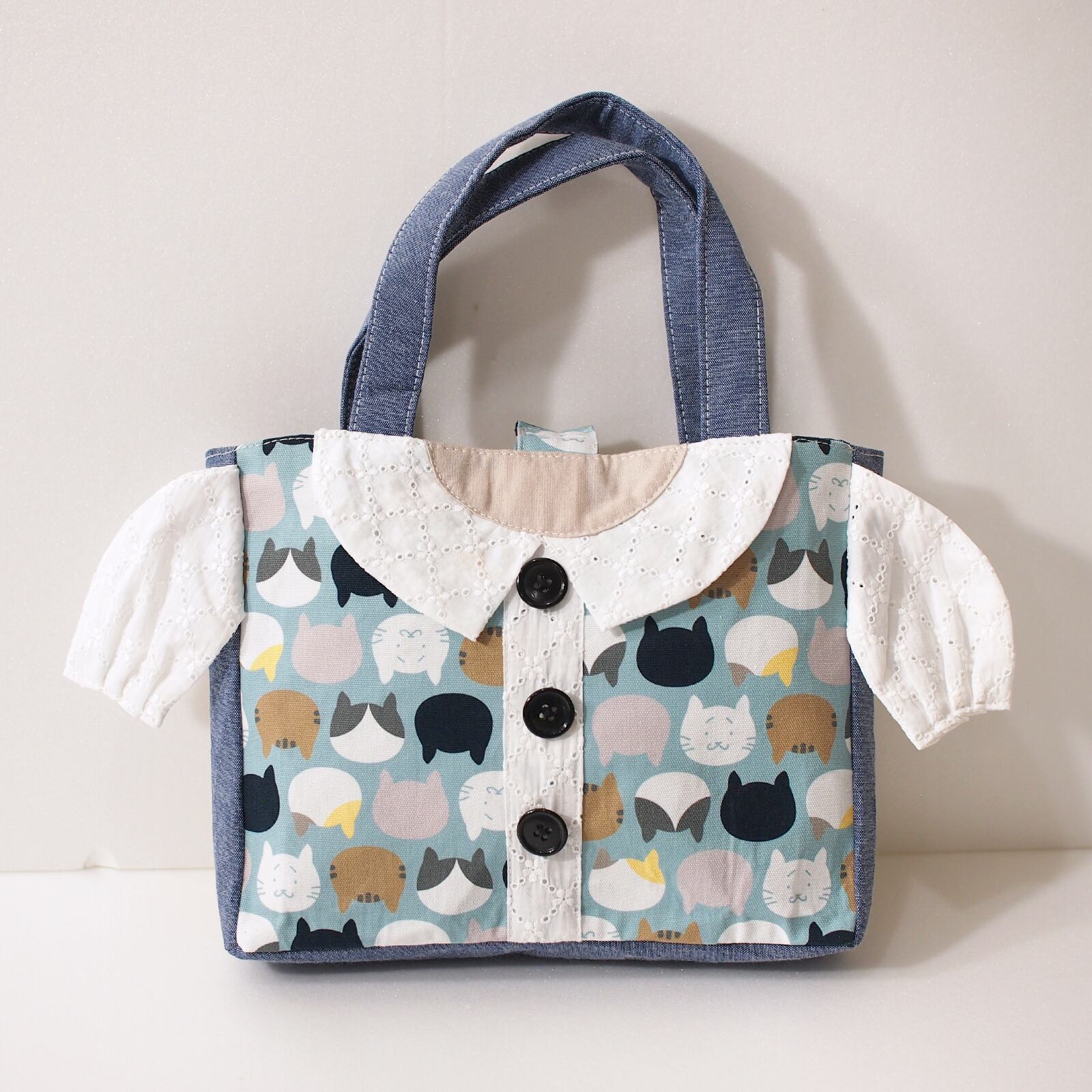 お洋服型のバッグ ブルー まゆねこいっぱい柄
