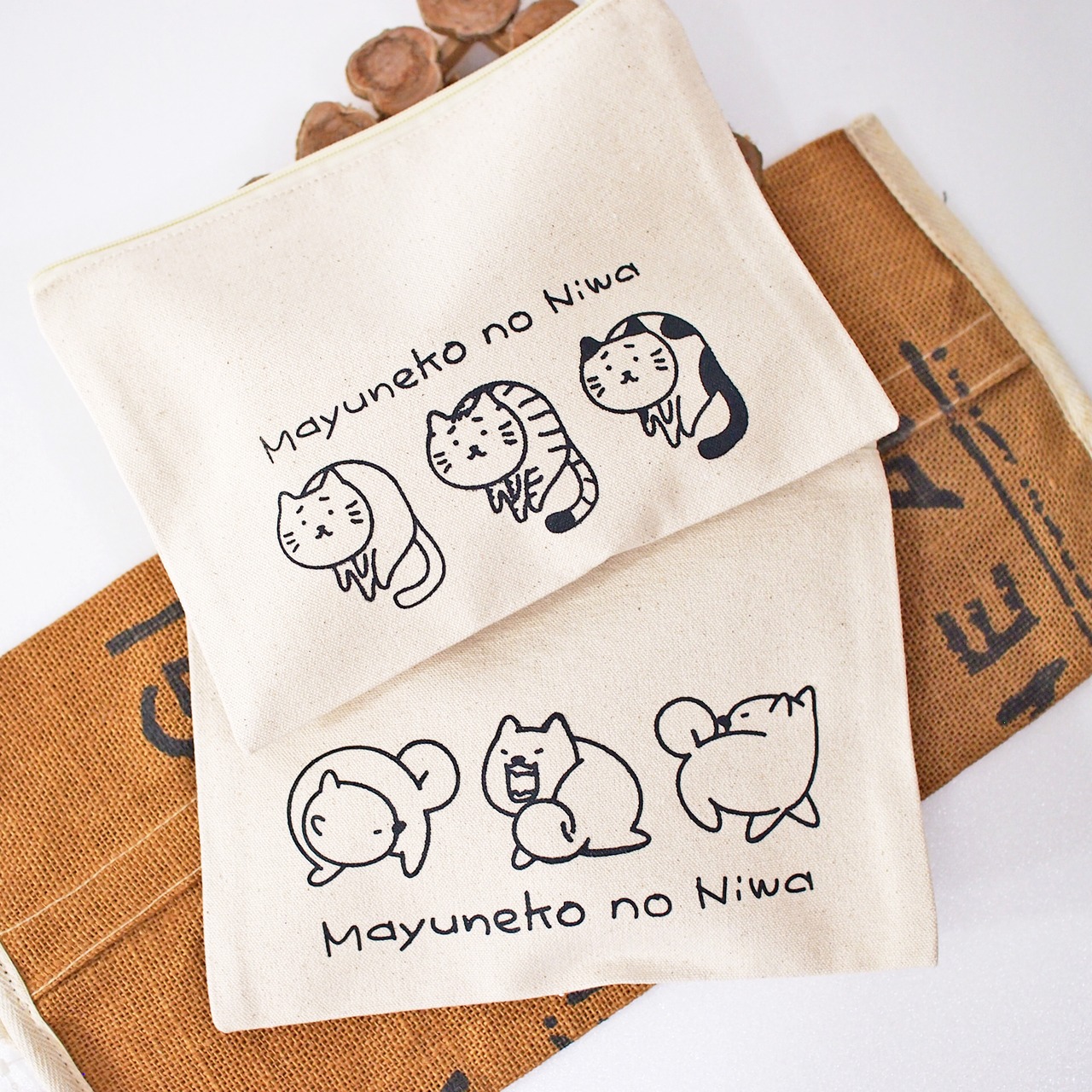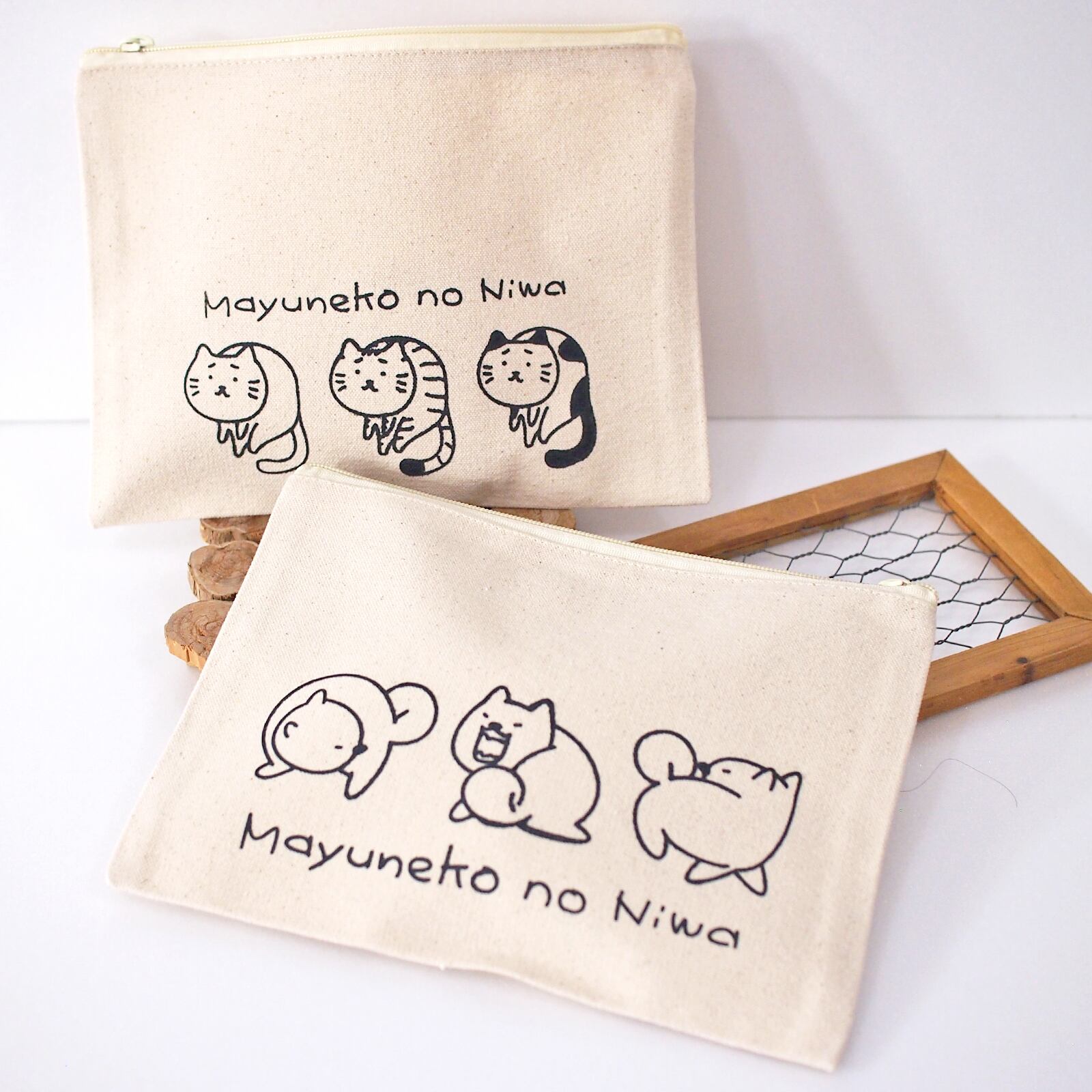 つかいやすい平ポーチ 猫 柴犬 まゆねこ 白 帆布 シンプル もに
