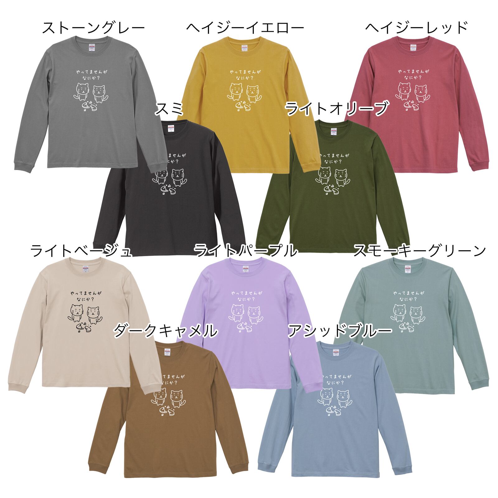 お好きなカラーとサイズの長袖Tシャツに、「やってませんがなにか?」柄をプリントするもによ