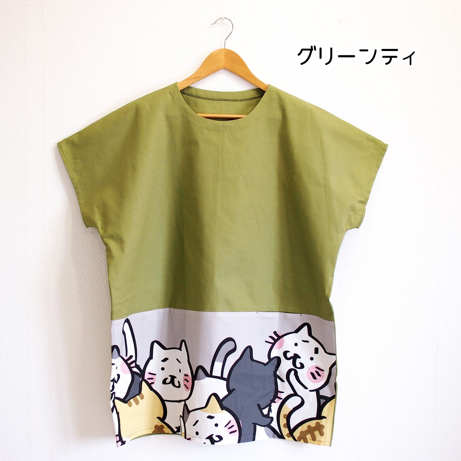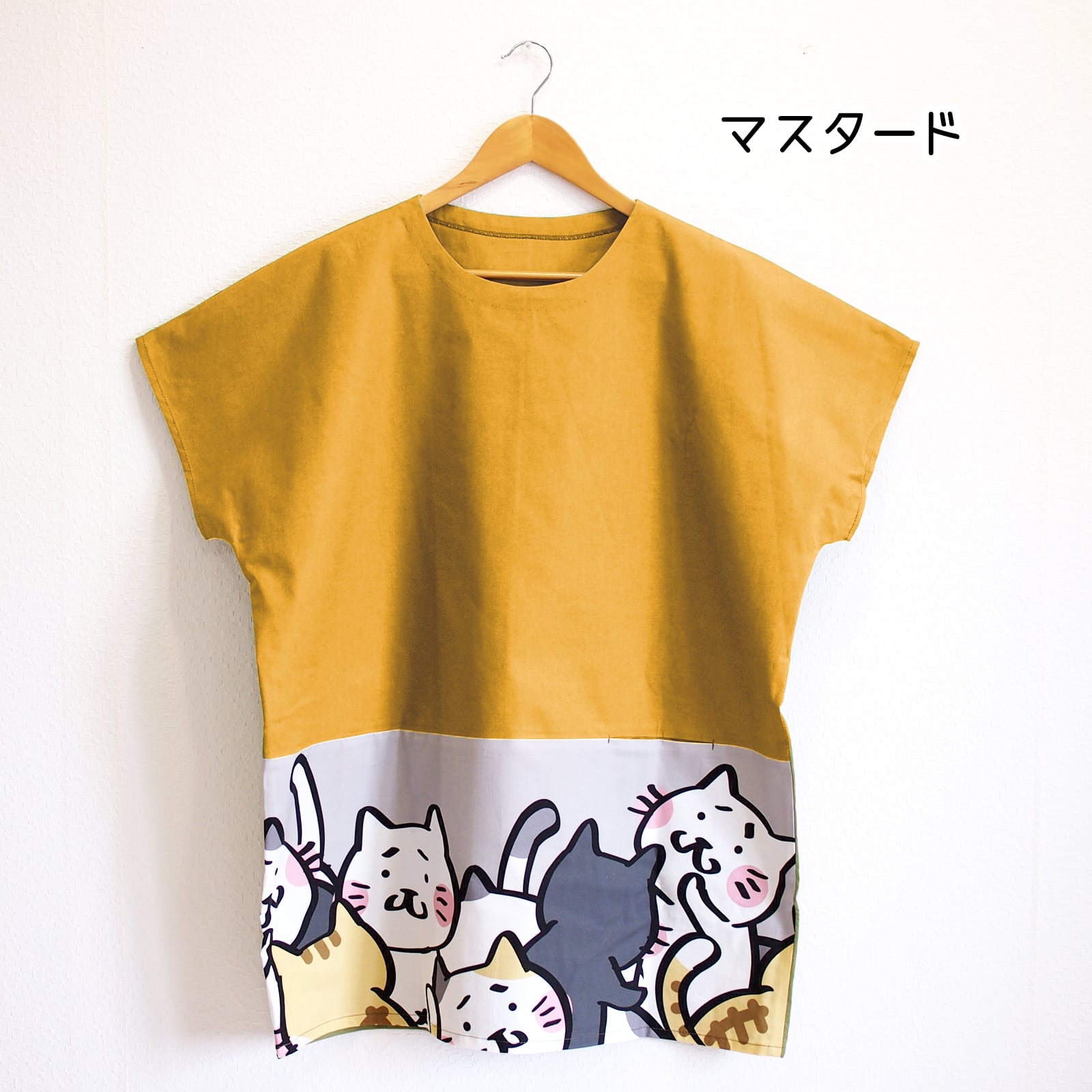 猫いっぱい切替し綿カットソー フリーサイズ 半袖 グリーンティ マスタード