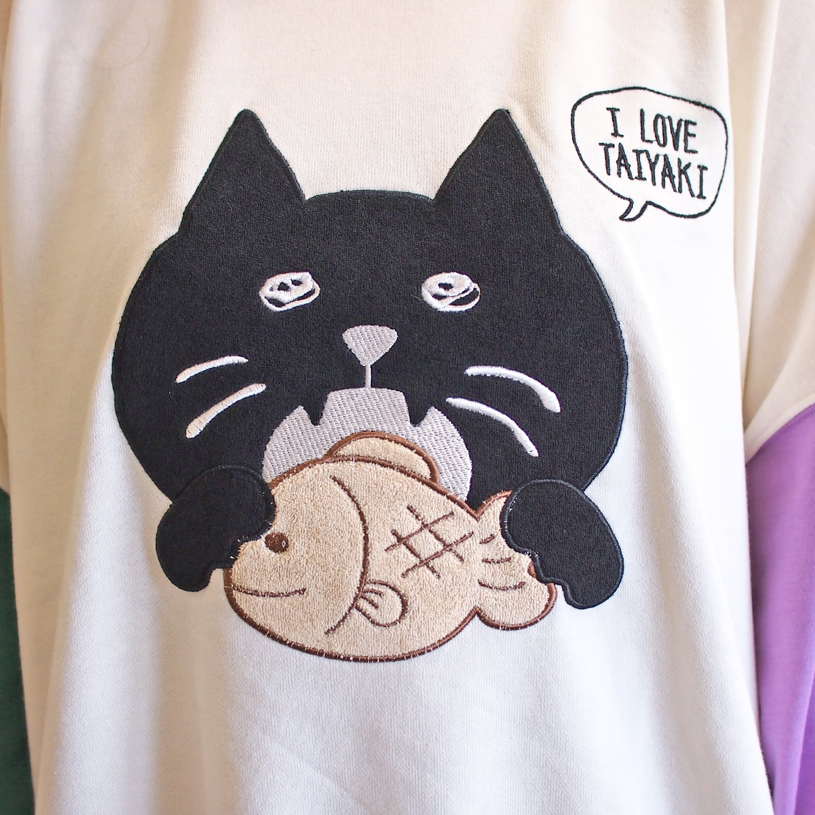 たい焼きをお口を開けて食べるねこちゃんのワッペンが付けてあります。