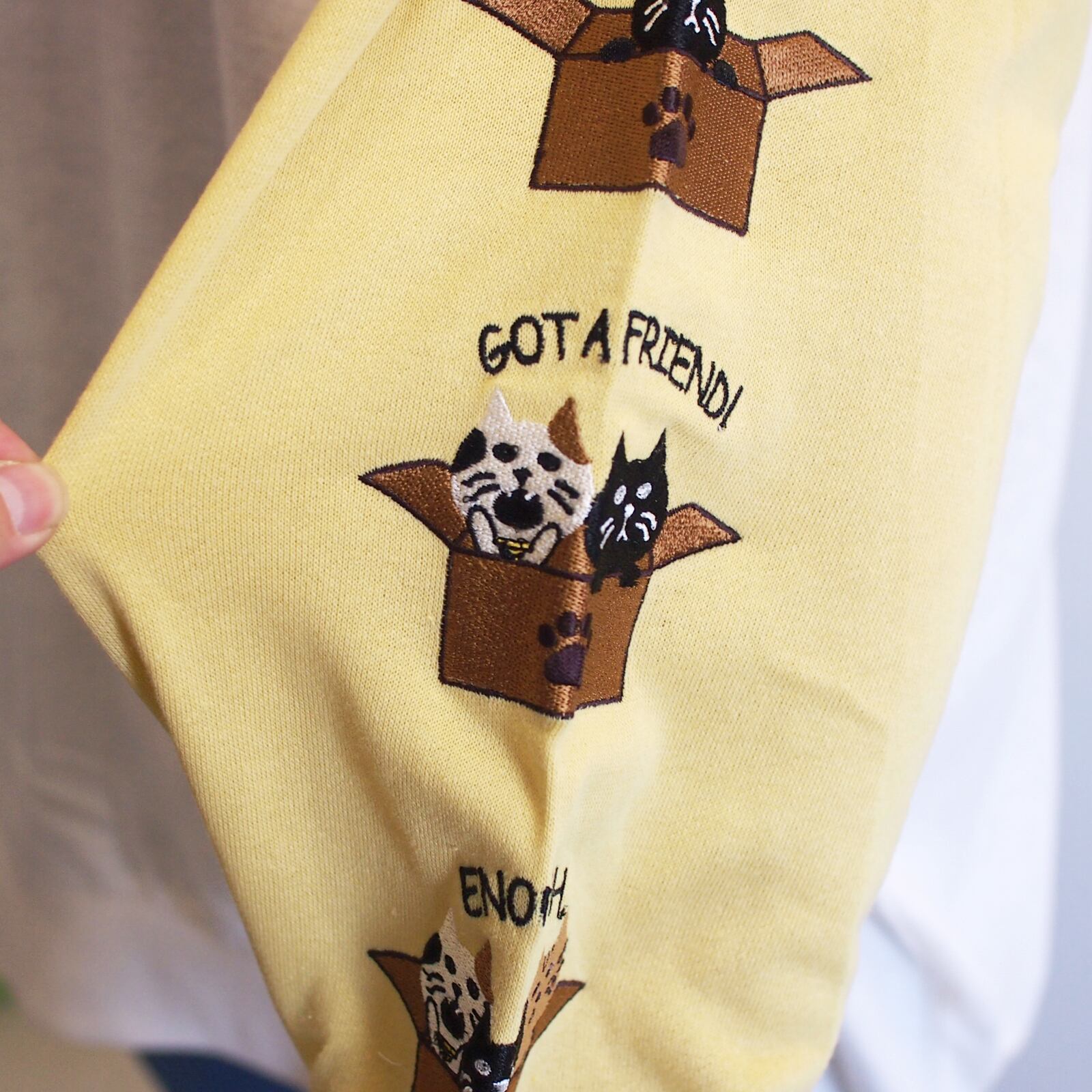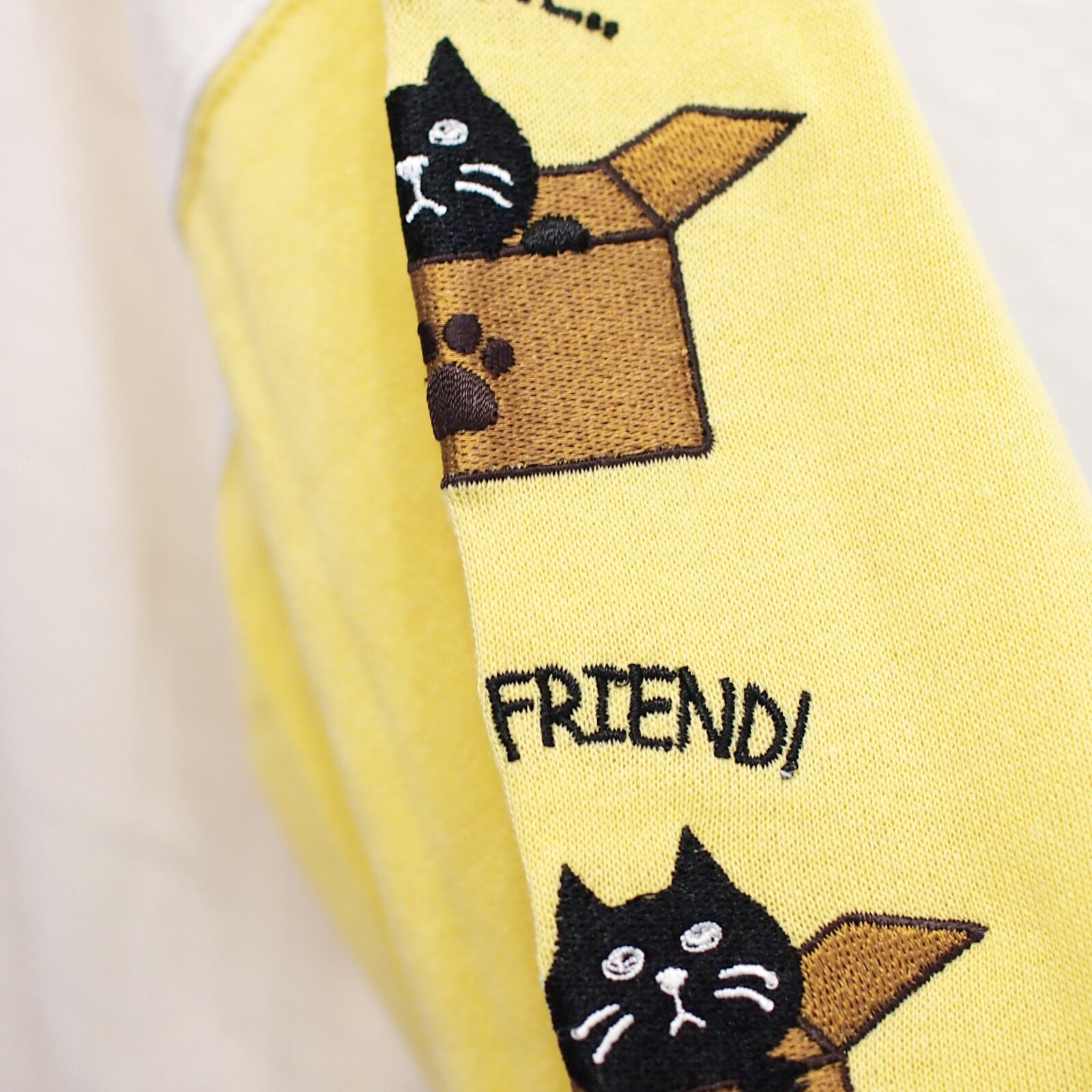 箱の中でねこちゃんが遊んでいる刺繍が袖にしてあります。