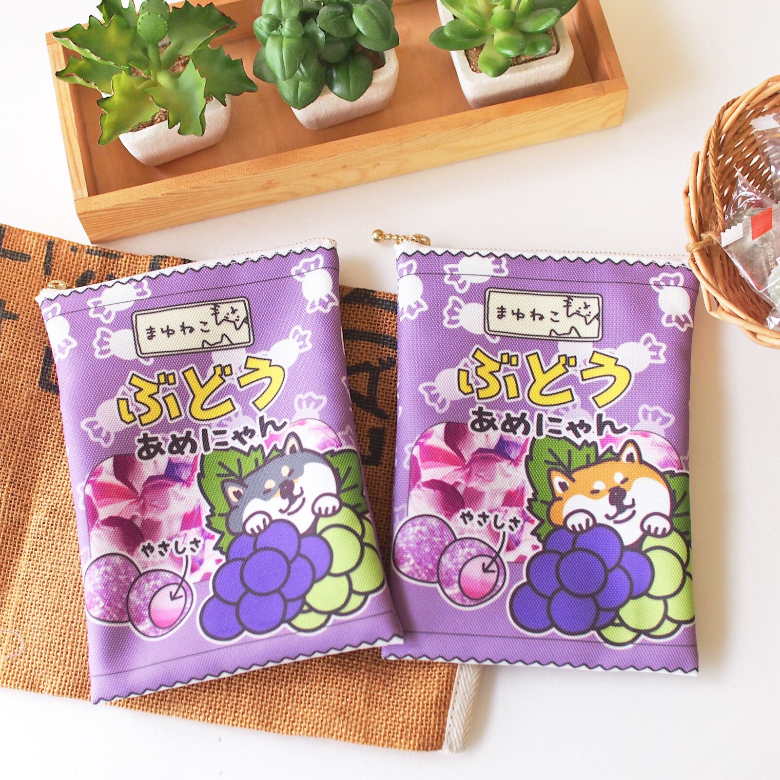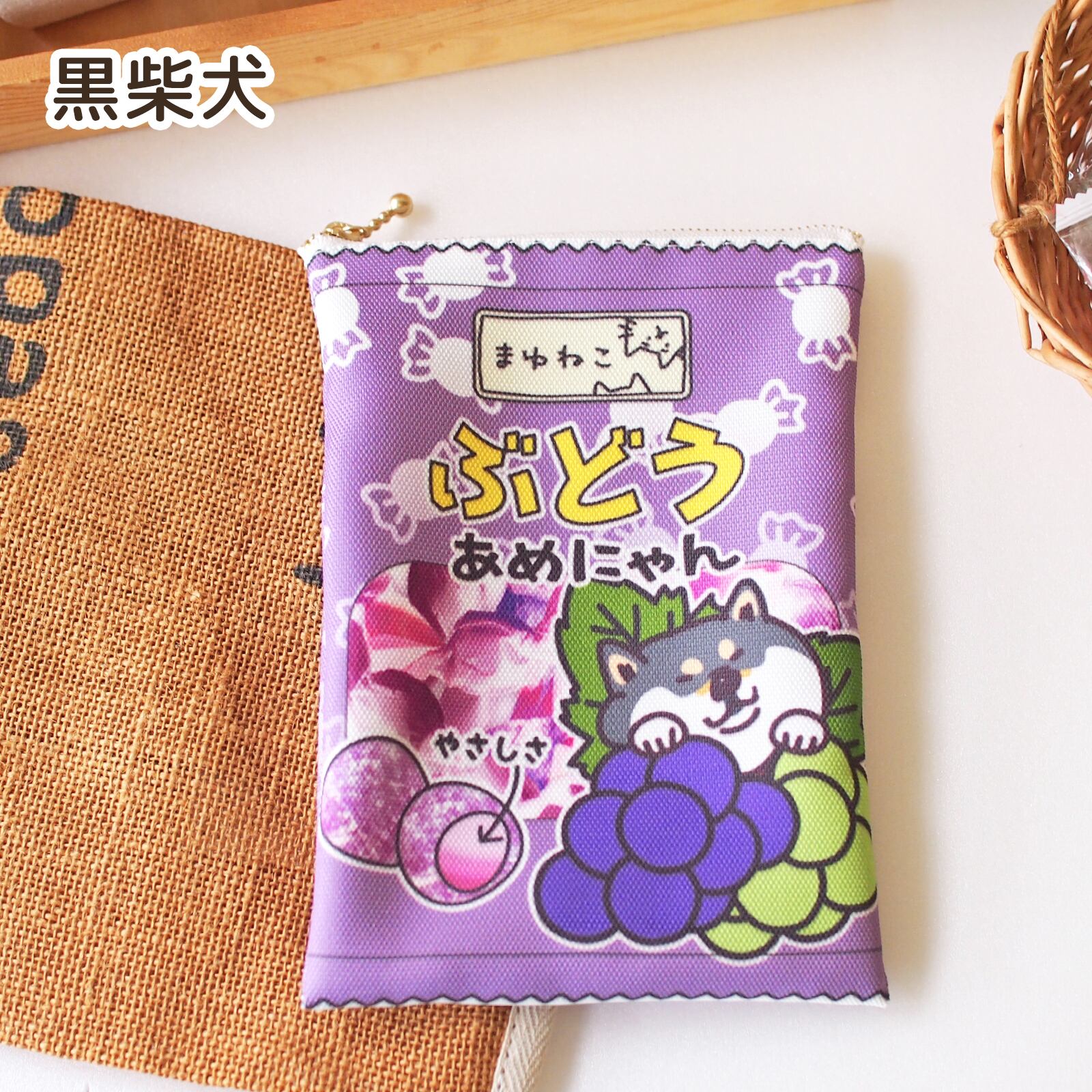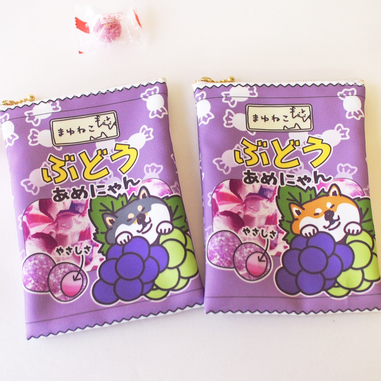 あめにゃん柴犬柄ポーチ キャンディ袋のような平ポーチ ぶどう 黒柴犬 赤柴犬 ですもに