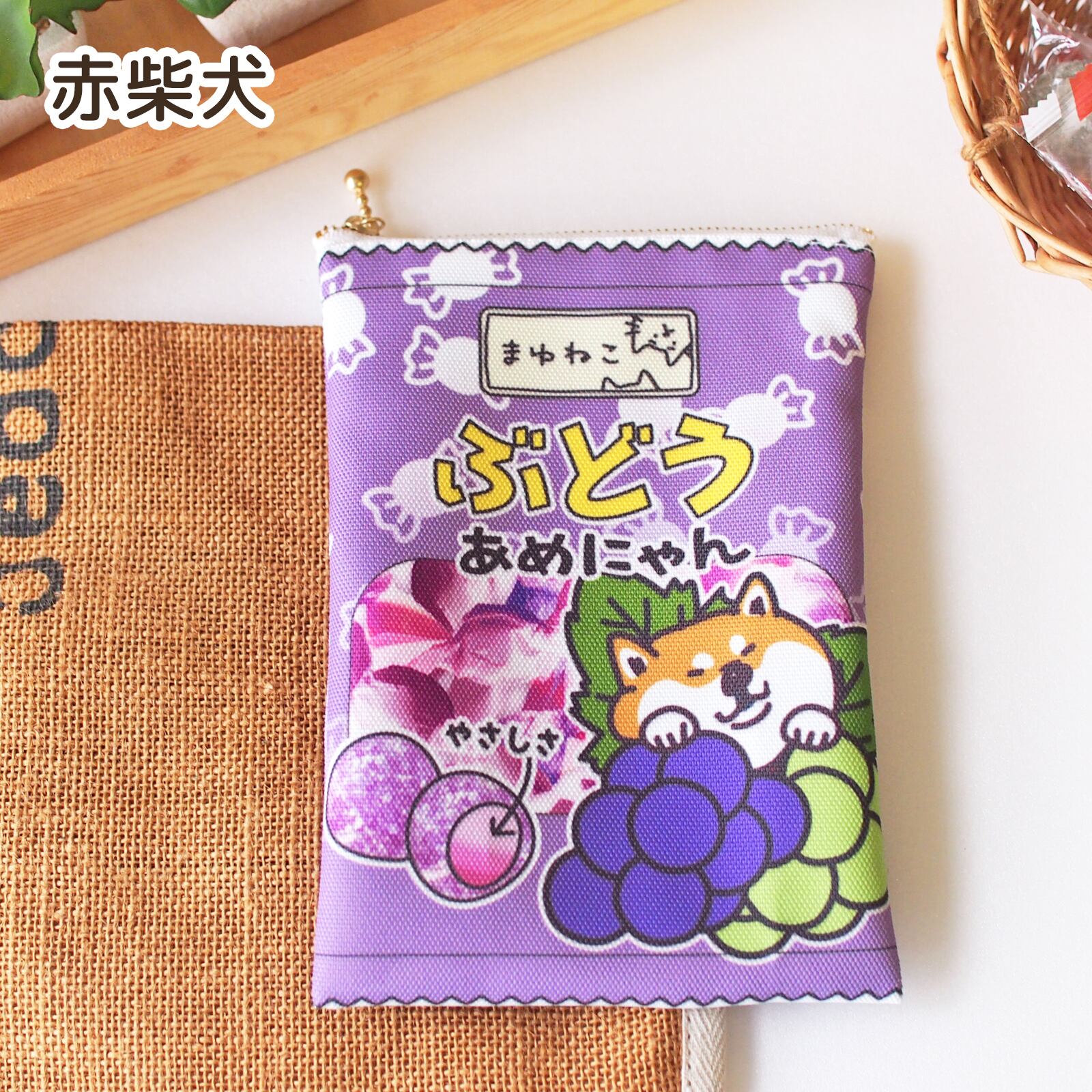 あめにゃん柴犬柄ポーチ キャンディ袋のような平ポーチ ぶどう 黒柴犬 赤柴犬