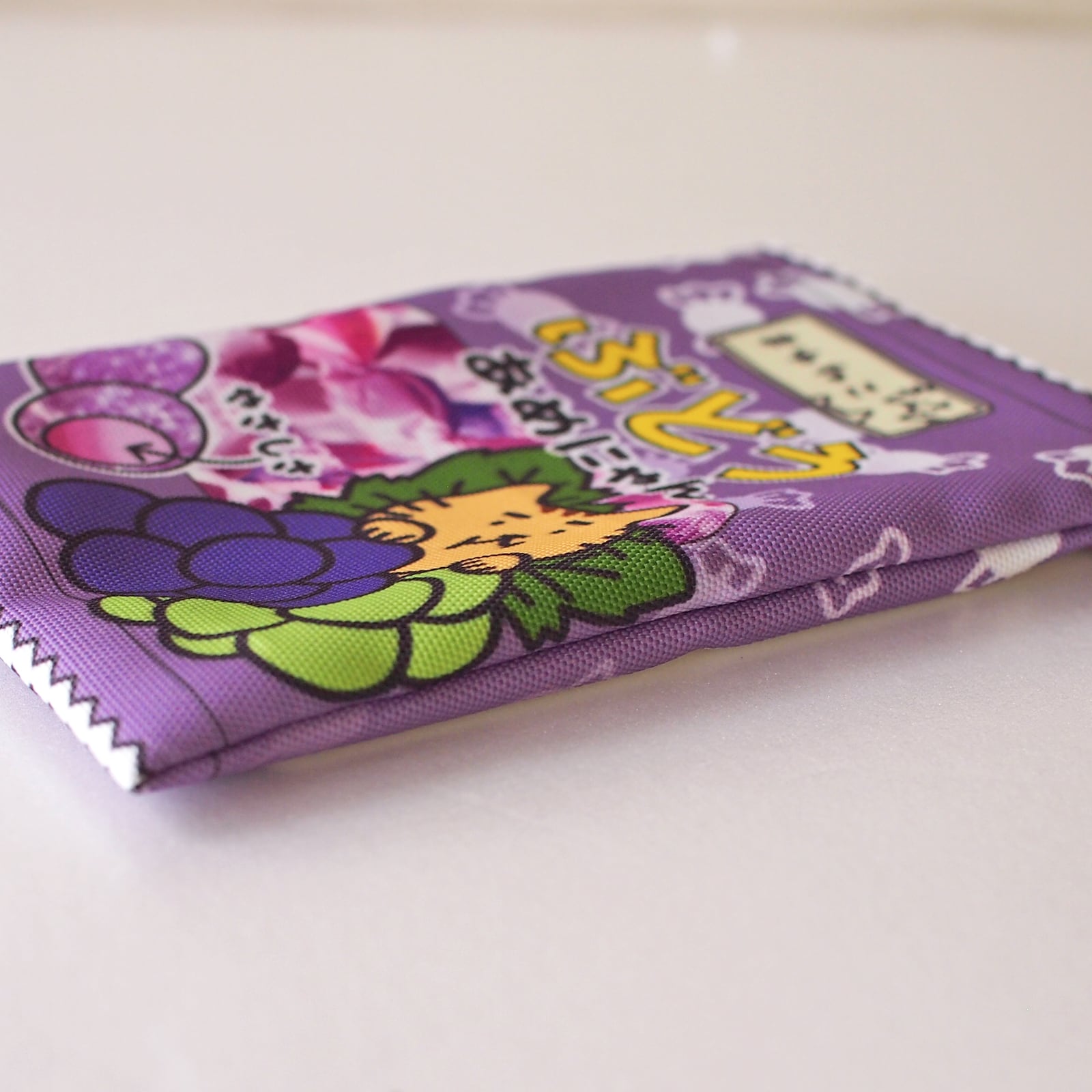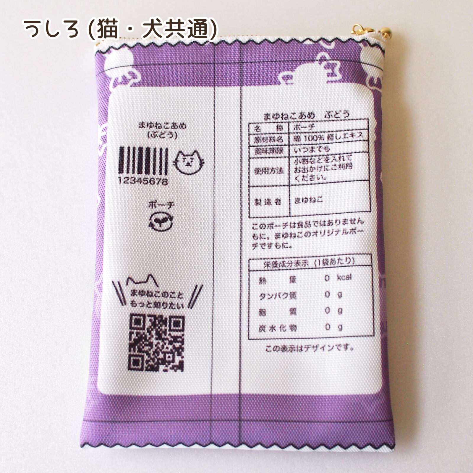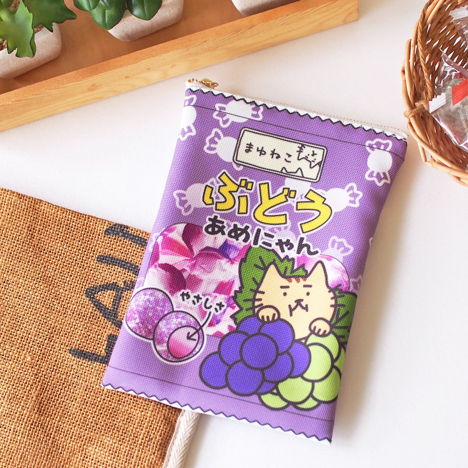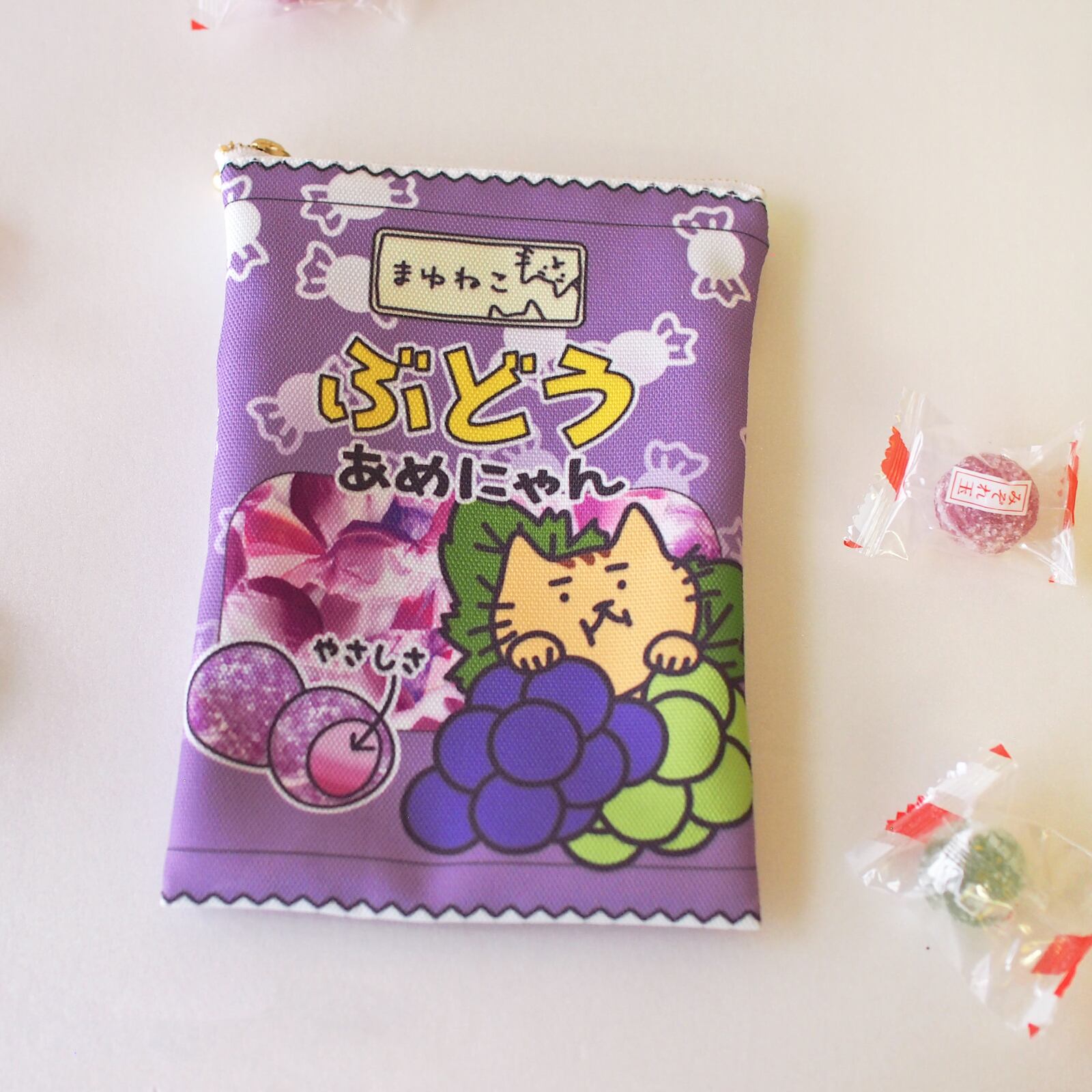 あめにゃん猫柄ポーチ キャンディ袋のような平ポーチ ぶどう まゆねこ ですもに