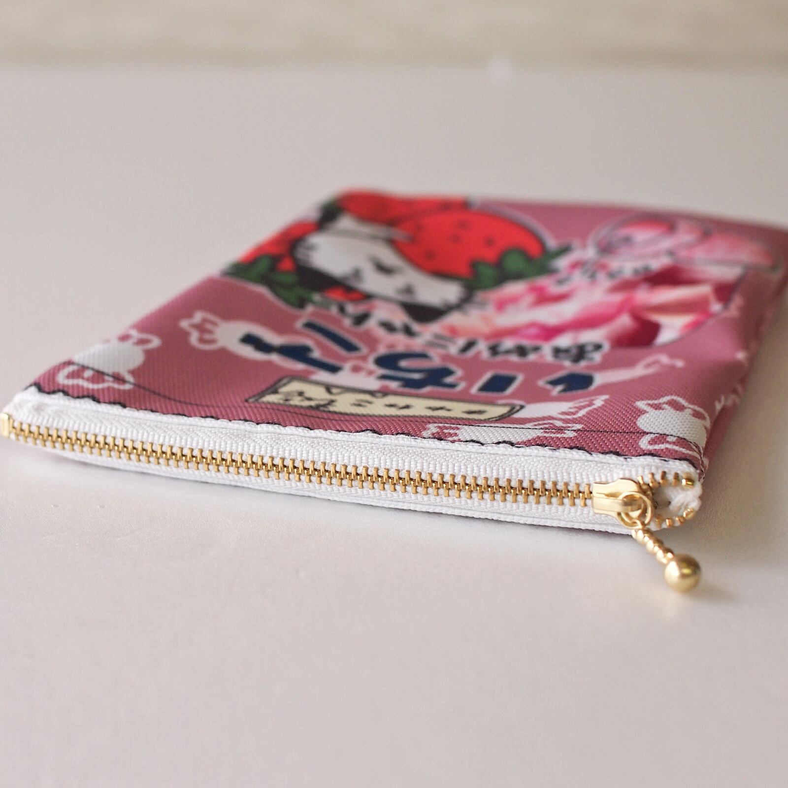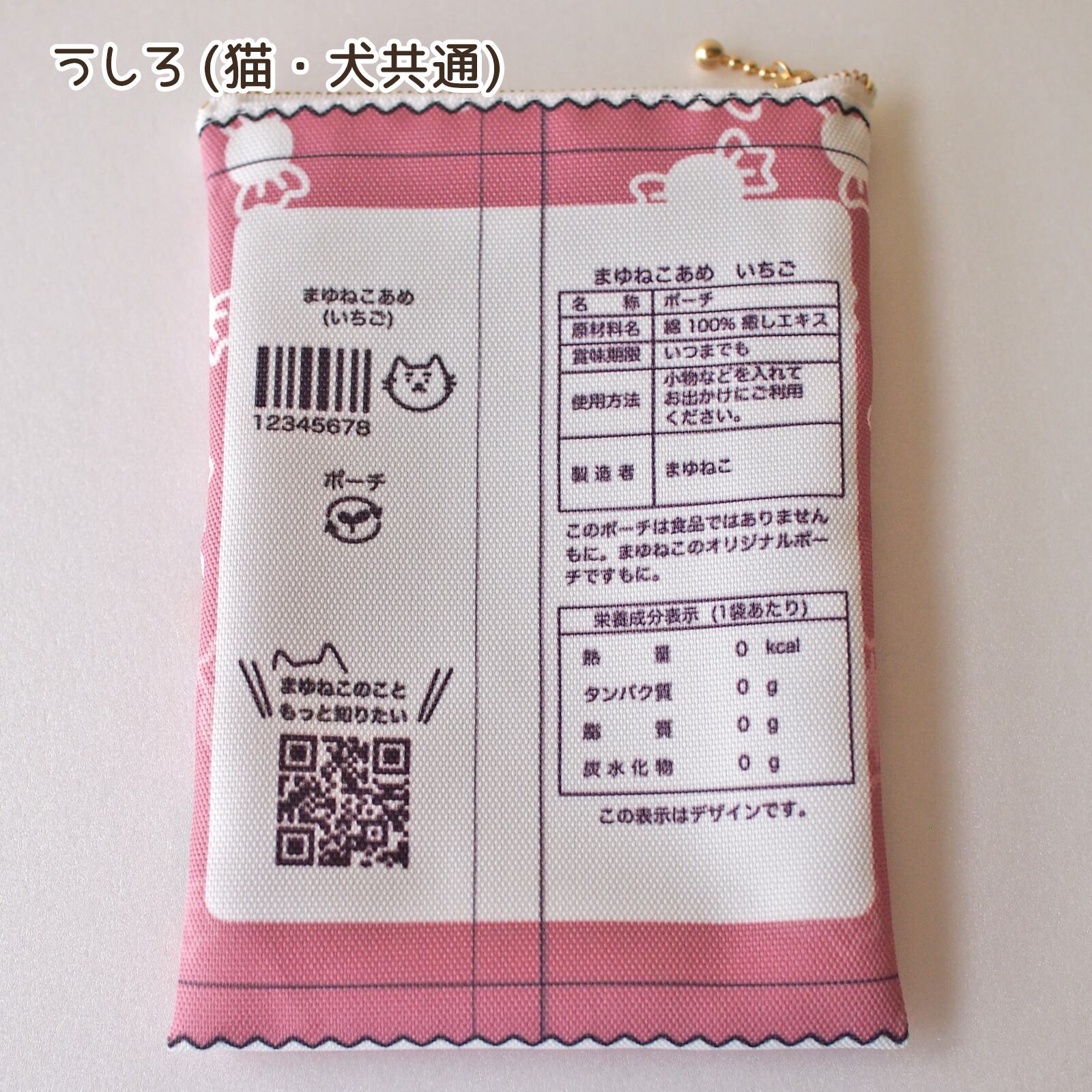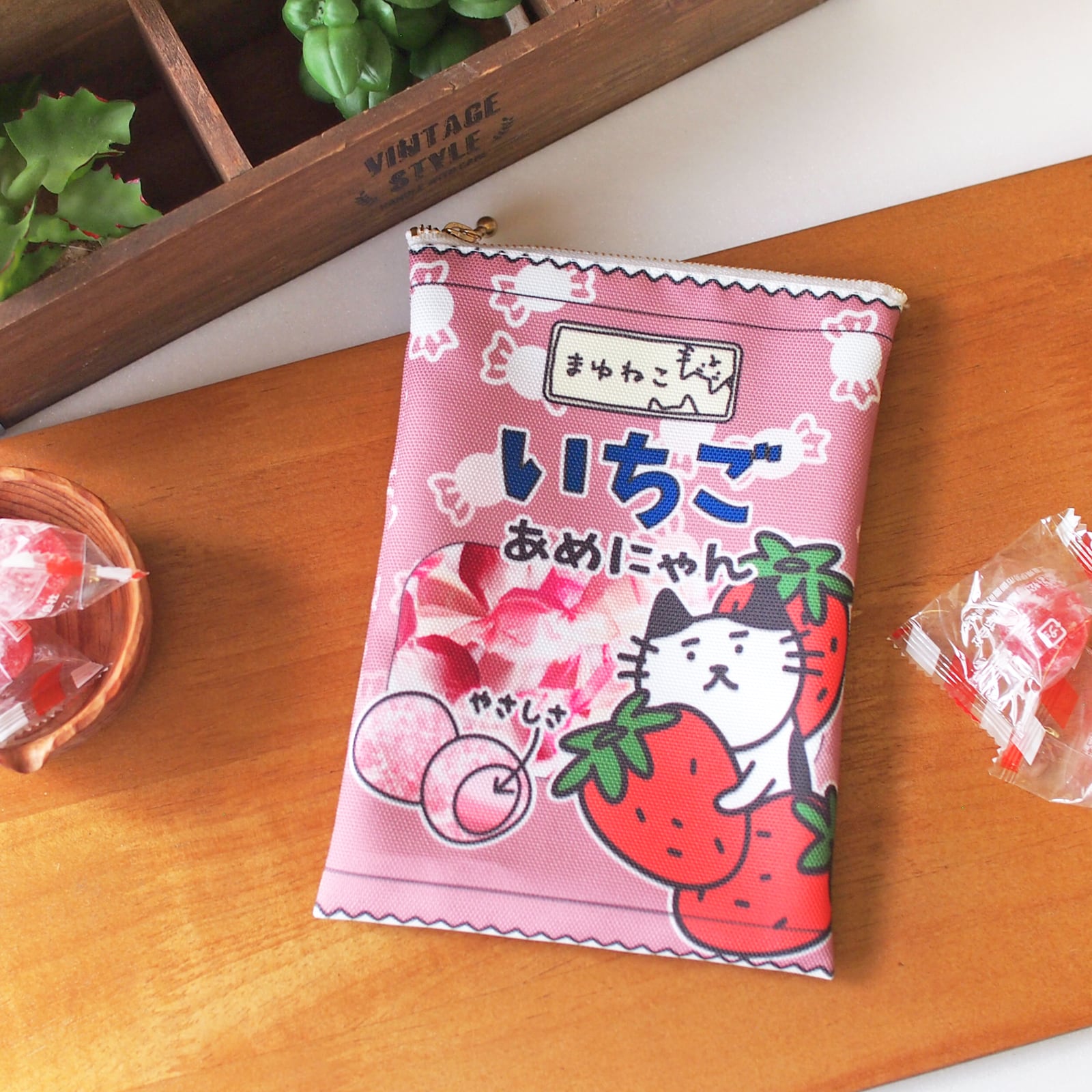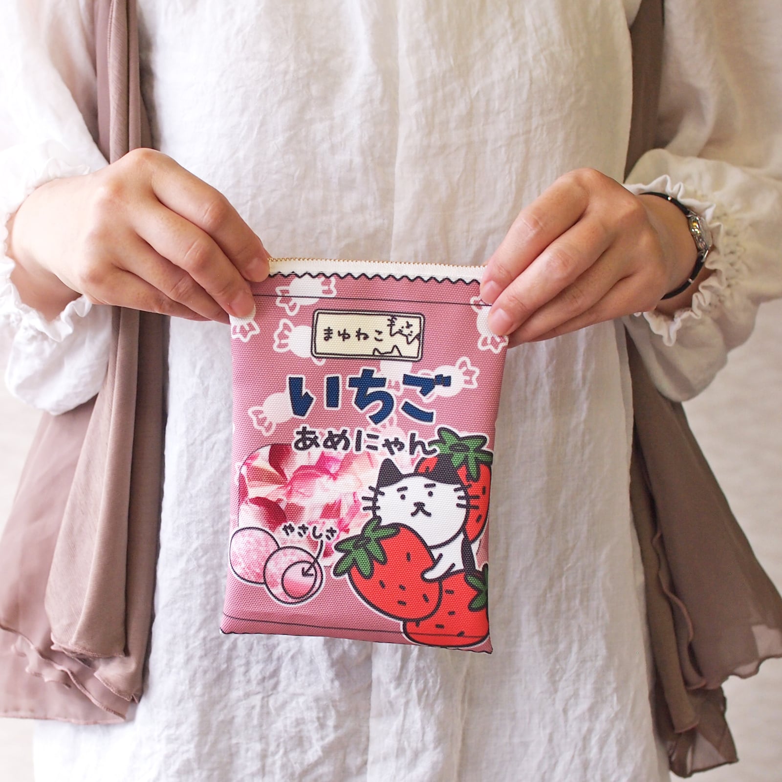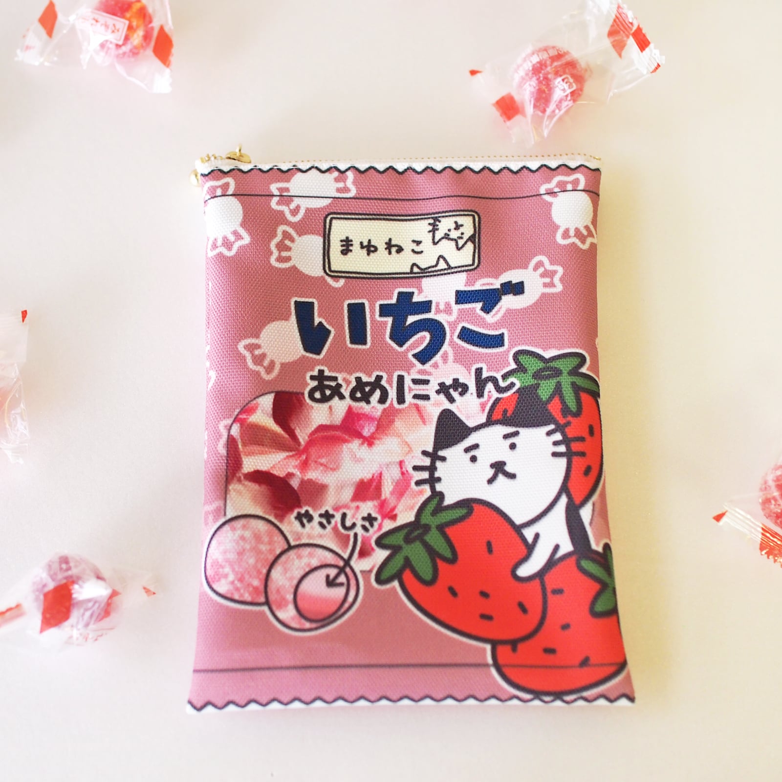 あめにゃん猫柄ポーチ キャンディ袋のような平ポーチ いちご まゆねこ ですもに