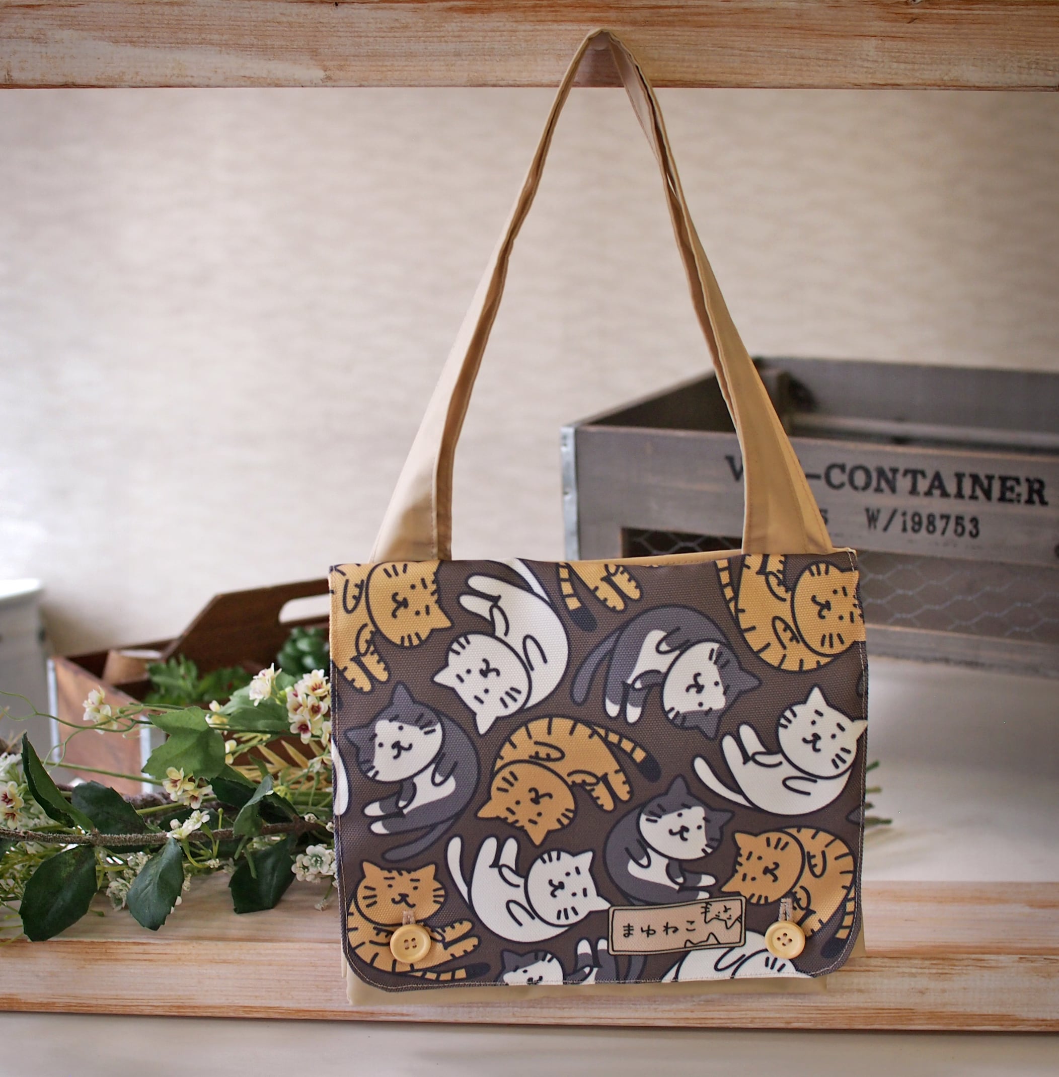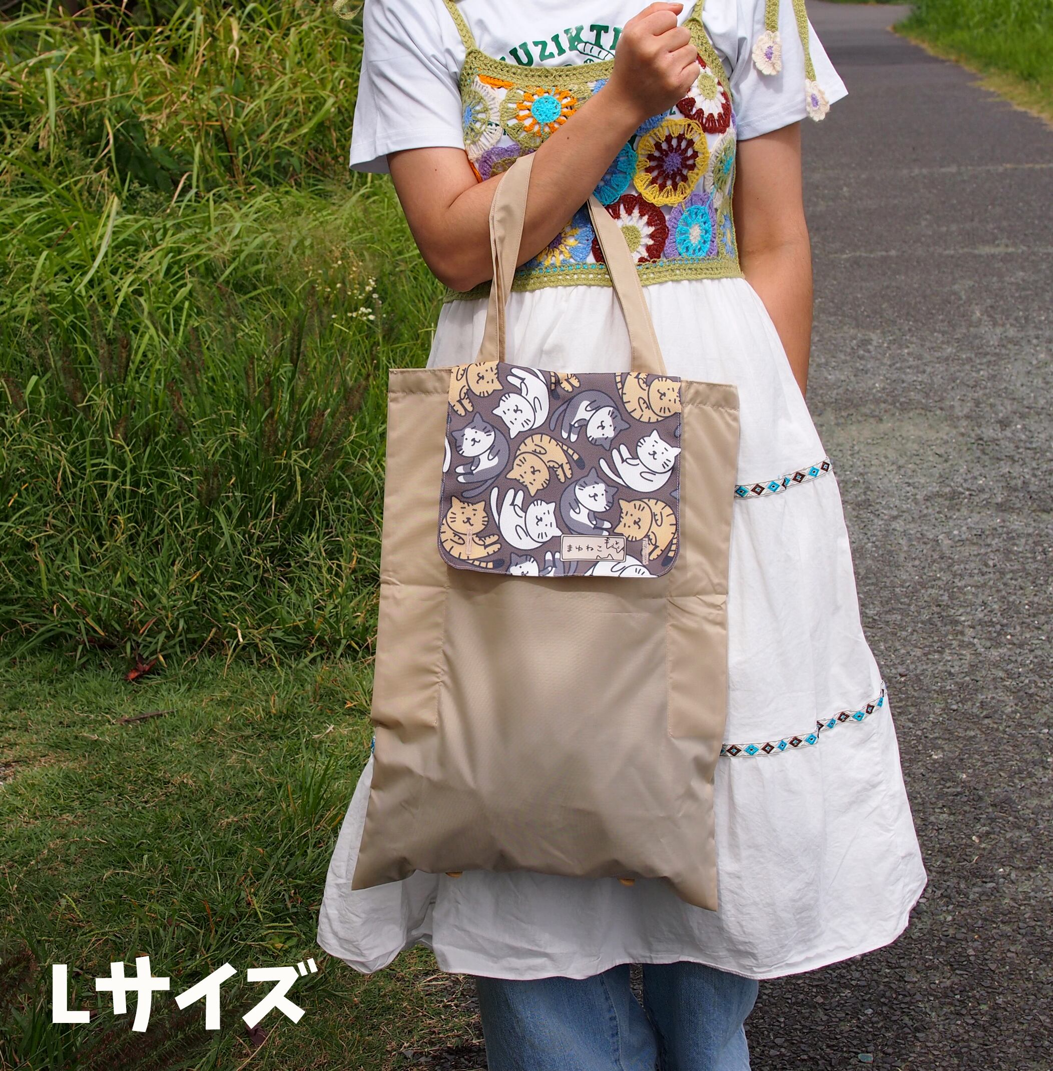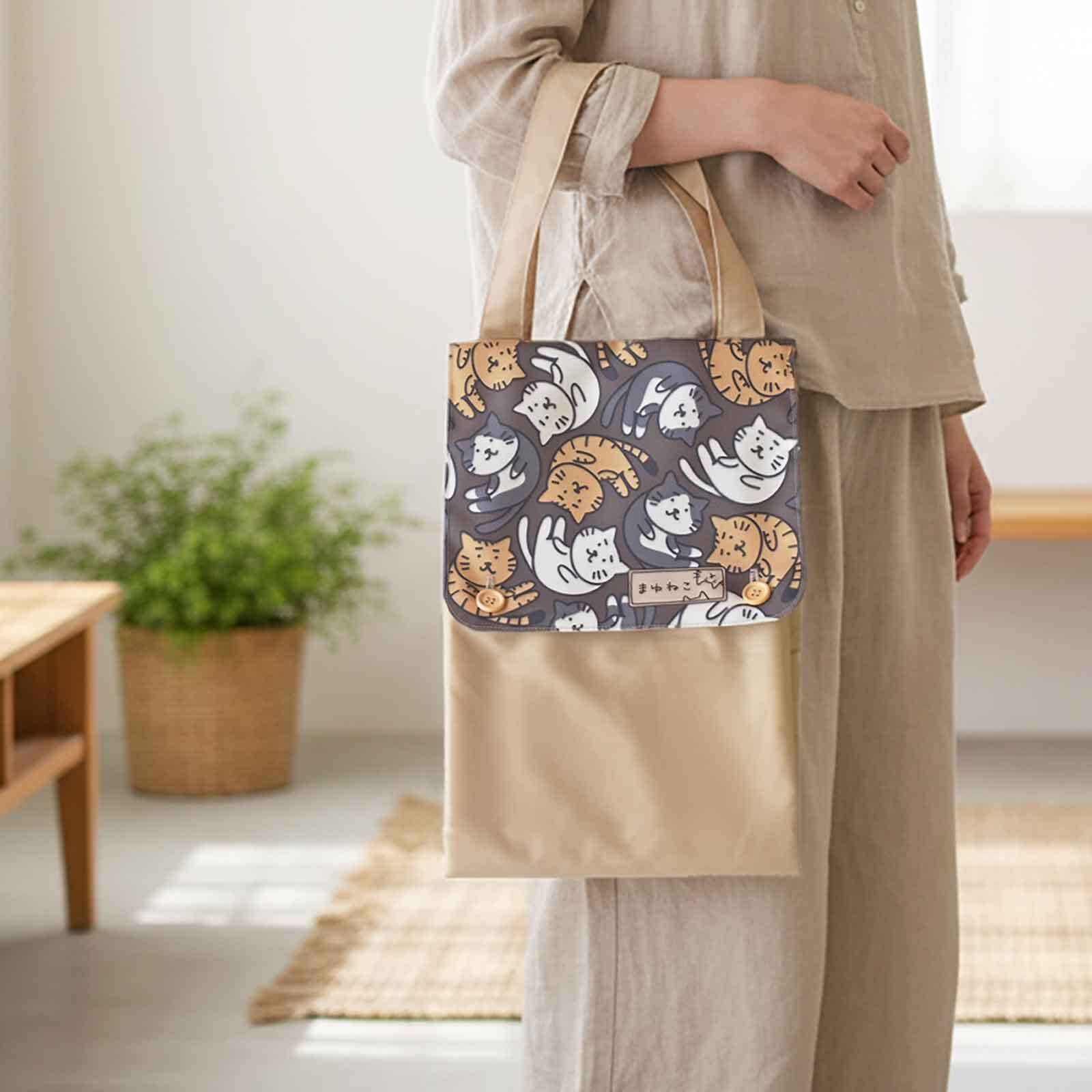 特許出願中 ぴたキャパトートバッグ 猫ブラウン サイズ変更ができるエコバッグ