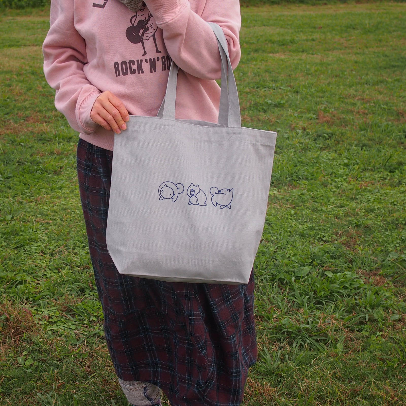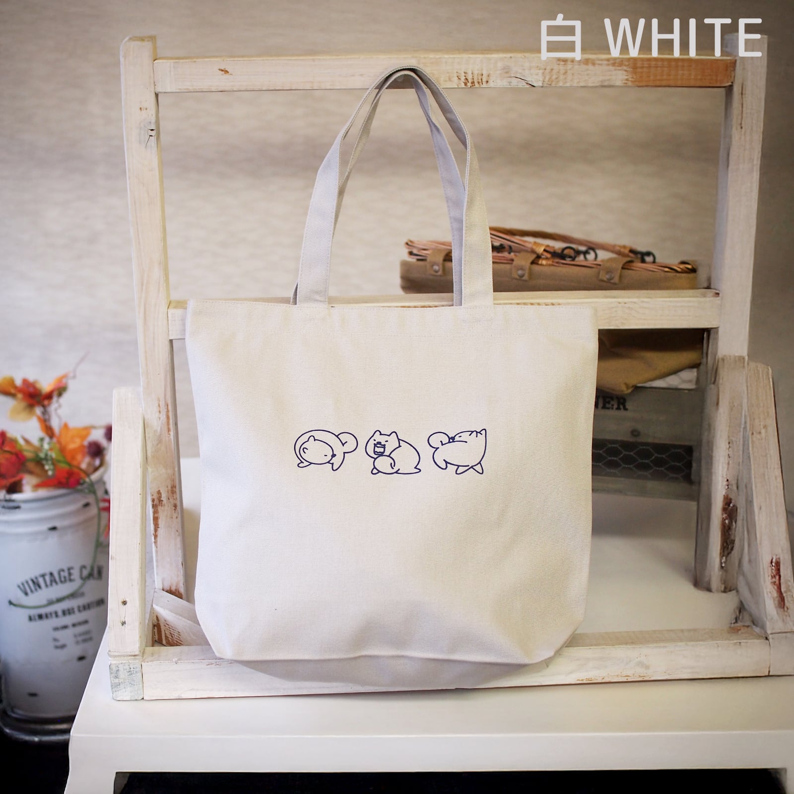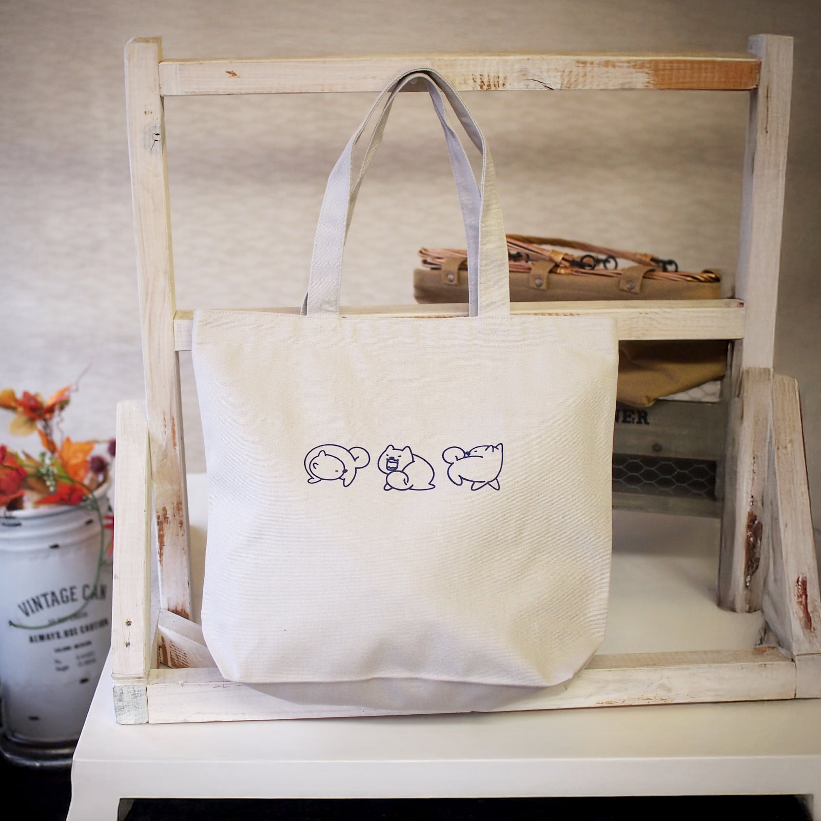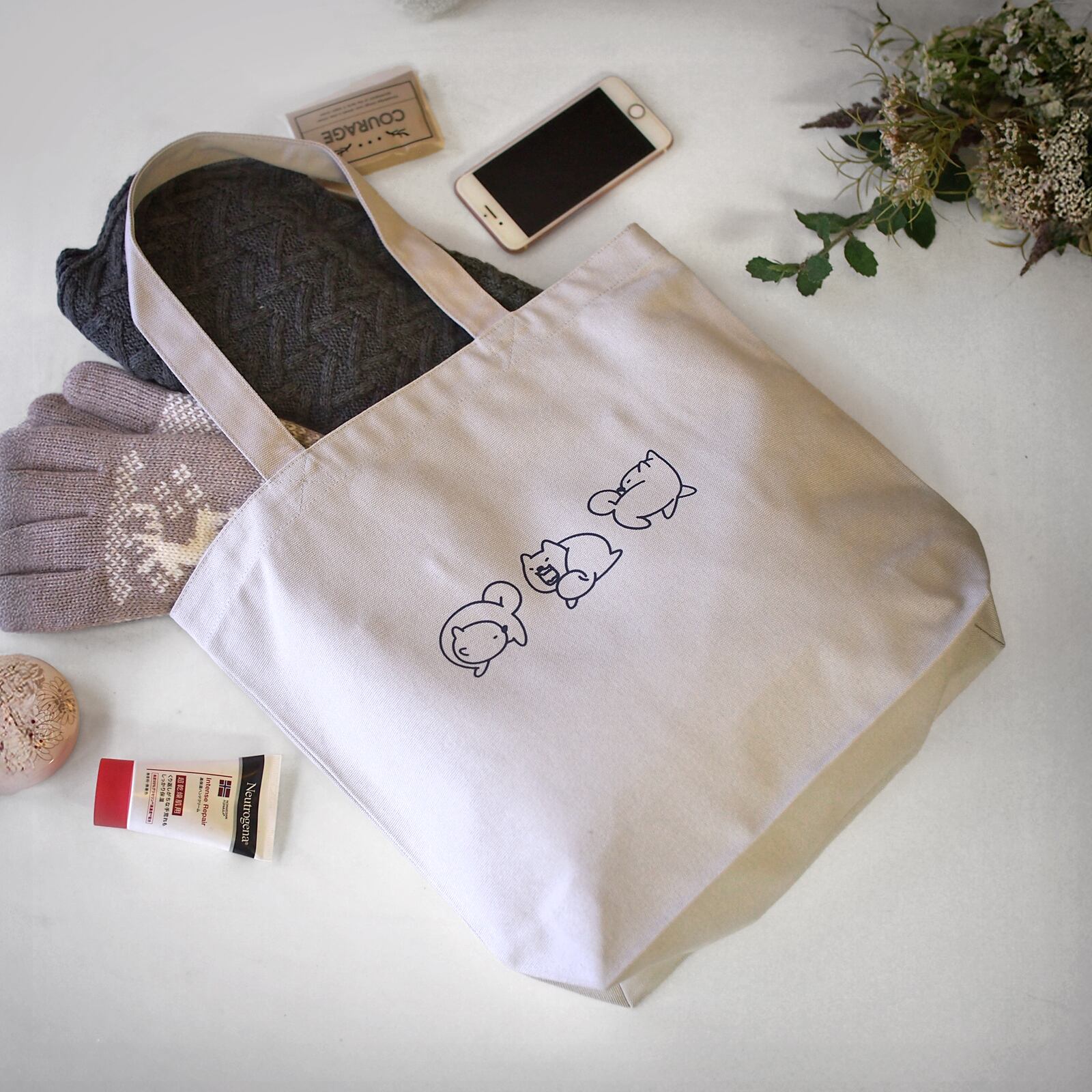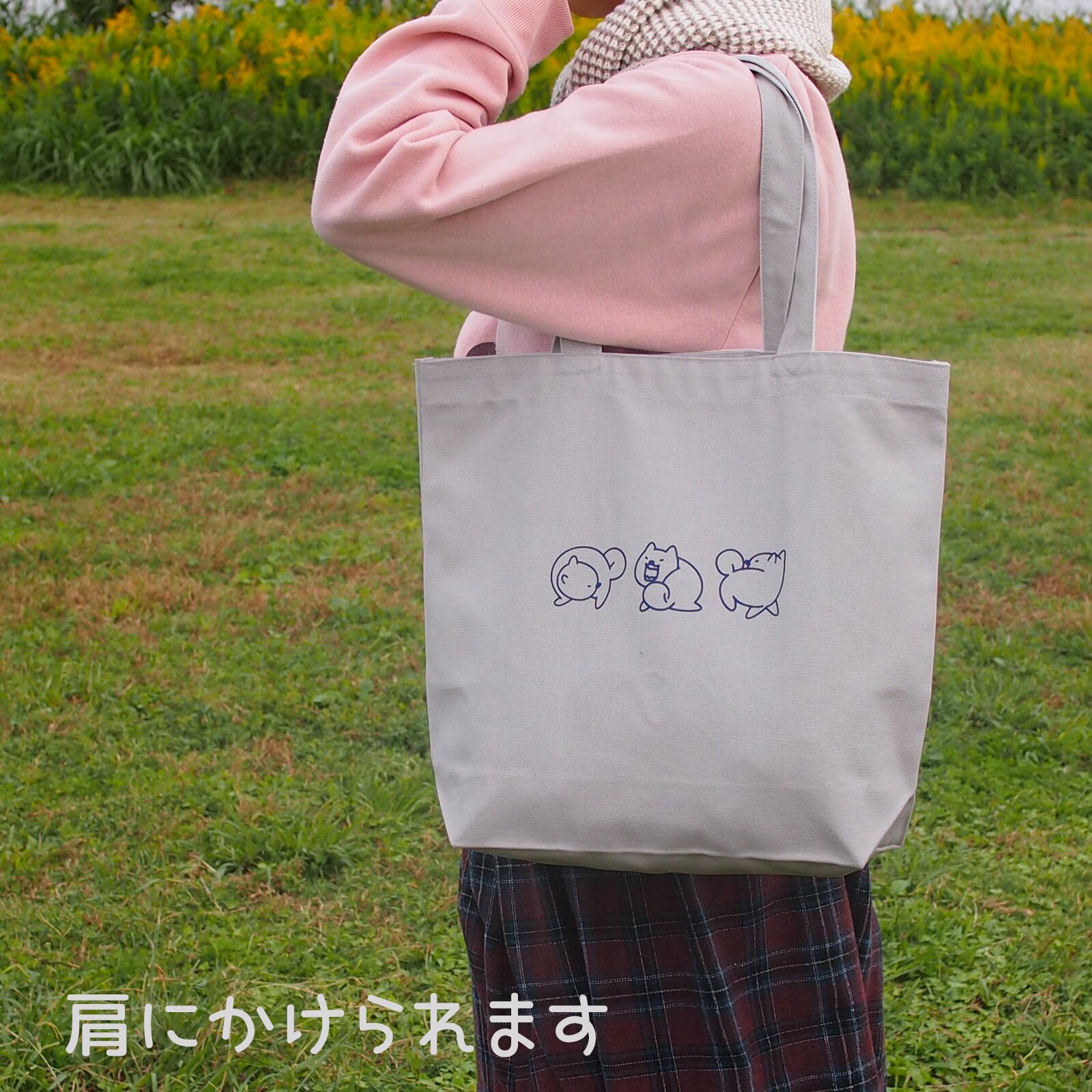 柴犬が尻尾を追いかける柄のA4キャンバストートバッグ 帆布 マチ大きめ ですもに