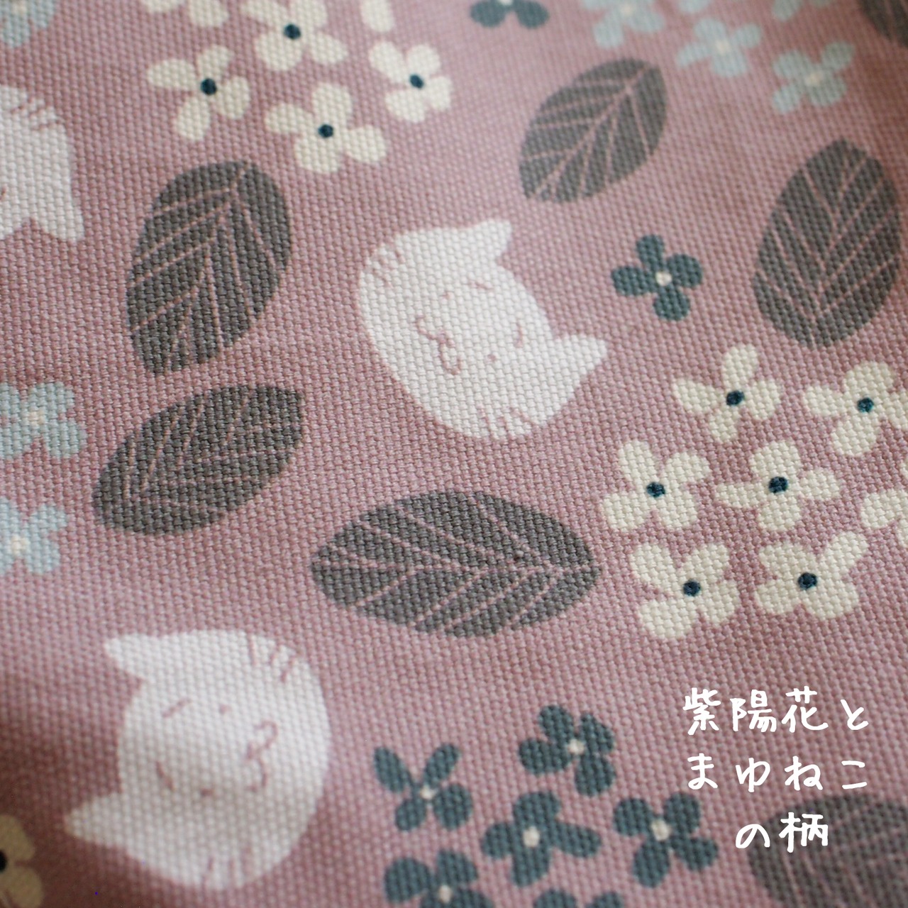 ■優しい色合いの紫陽花とまゆねこちゃんのオリジナル生地で、丸いころりんバッグを作りました。