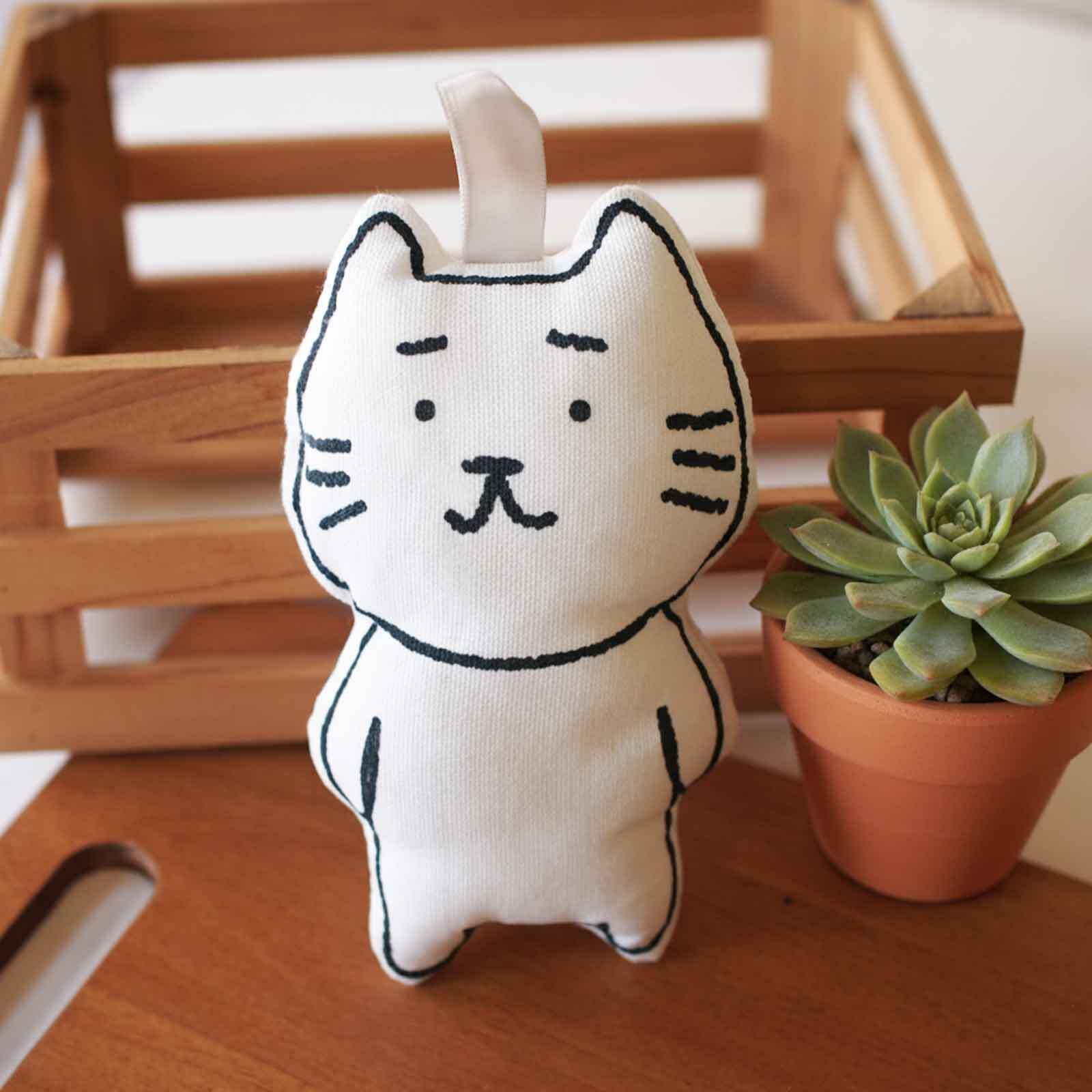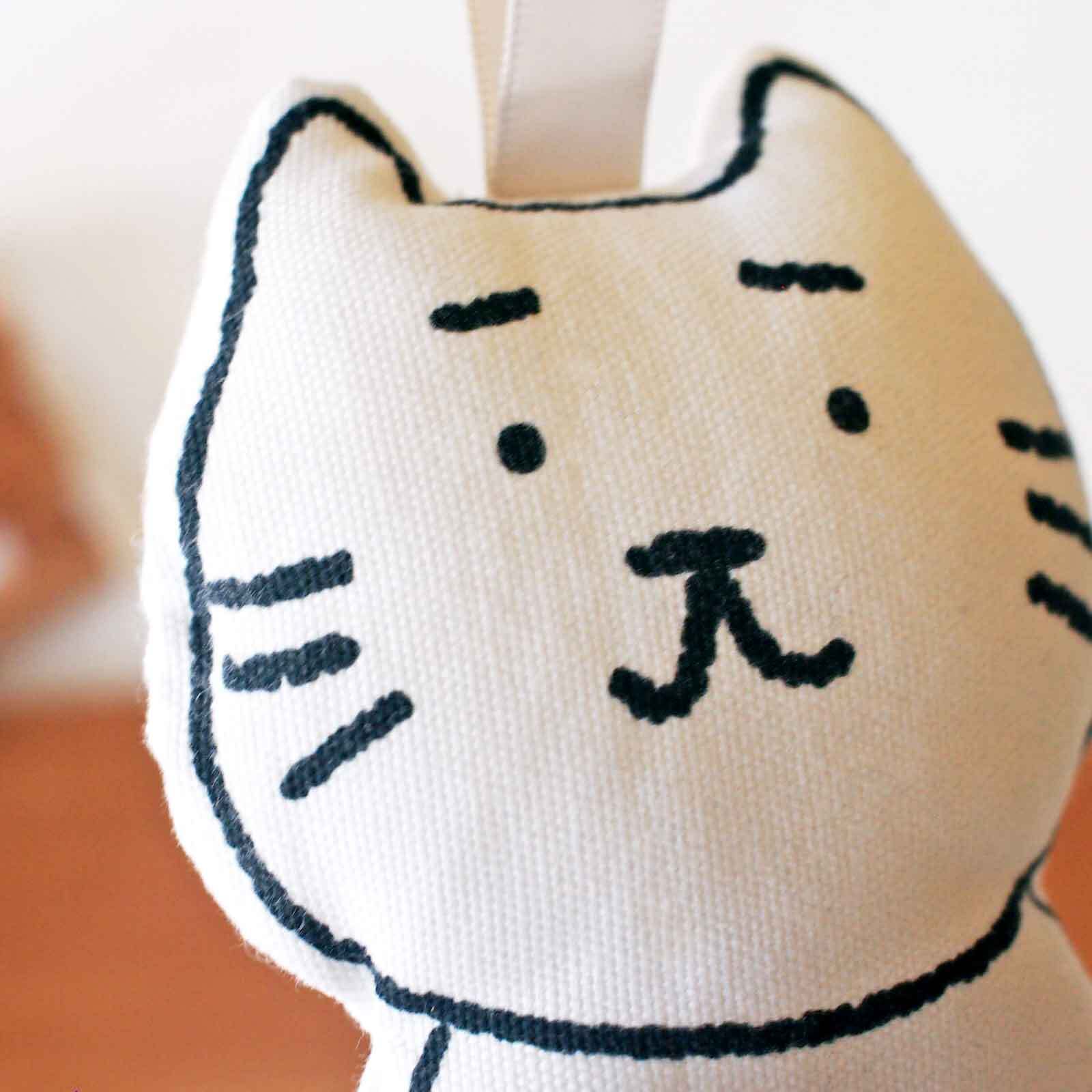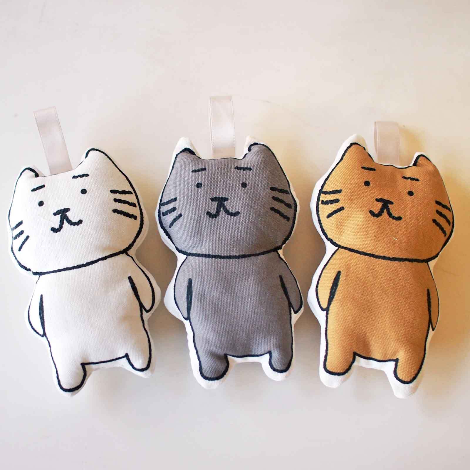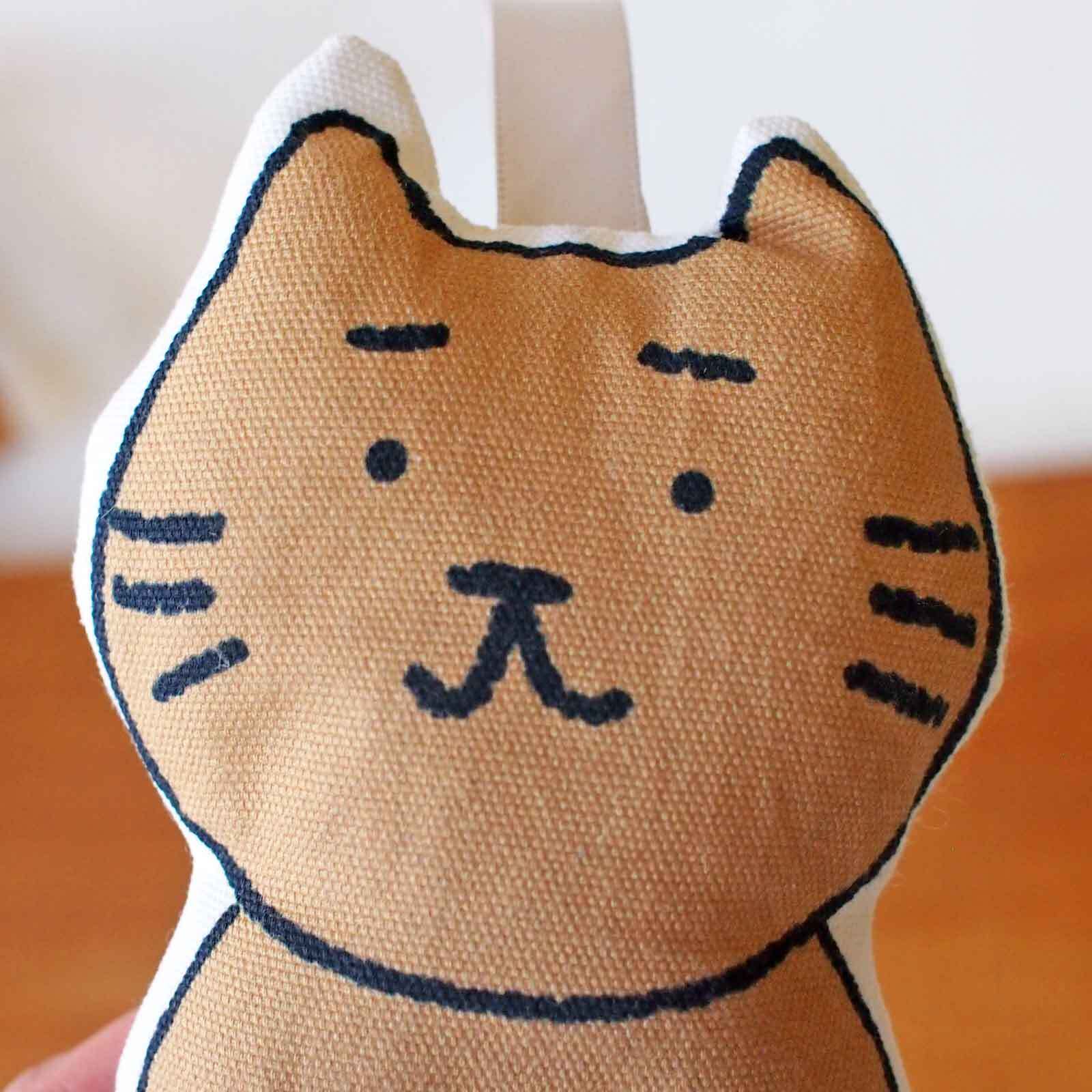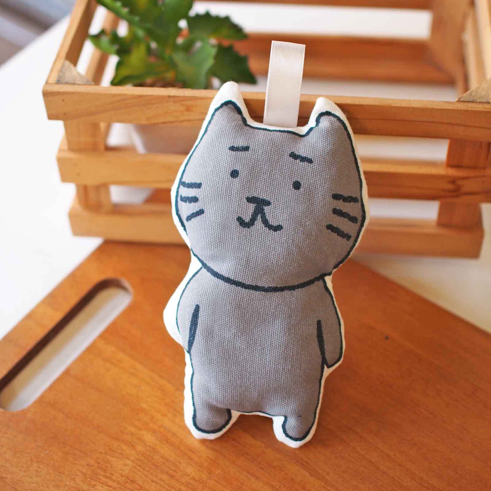 ■まゆねこのぬいぐるみです。まゆねこのプリント生地に綿を入れてぬいました。
