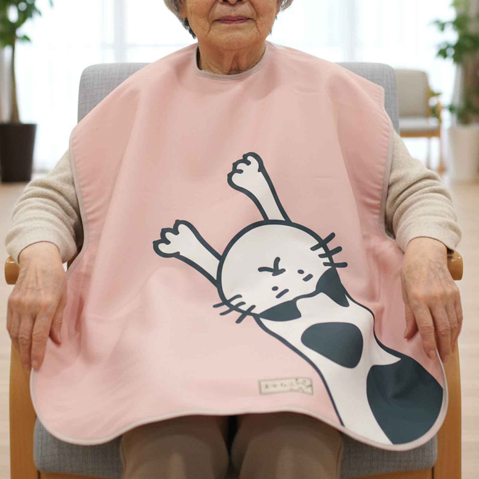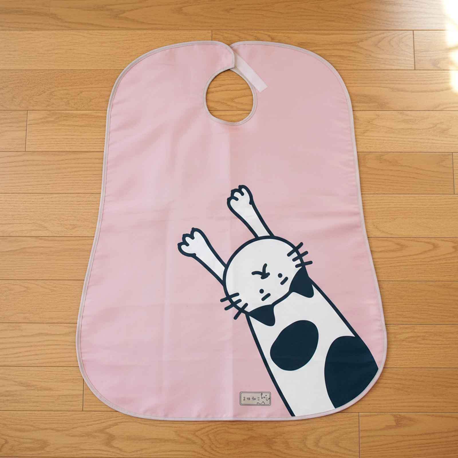 猫ちゃんが抱きつく可愛い 大人用スタイ 大きめ ピンク 介護用 おしゃれ介護用エプロン ですもに
